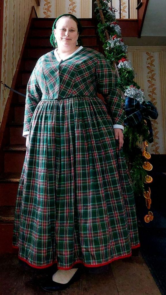 For such a rushed dress and having not made myself a garment in a long time, I am pleased with the fit. I opted to treat the fabric as if it were wool rather than cotton because of the weight and the winter purpose. Plus, the plaid wanted to. I went for a bit shorter skirt to save on fabric. Ironically, I have enough left that I may add some bias either to the skirt or sleeve or something. The skirt is 4 45″ panels, gauaged to the waistband. The hem is faced with a reproduction cotton print and bound with red cotton tape, as I did not have a wool hem tape on hand. The front bodice pieces are cut on the bias to create the Vs. Initially, I pleated the bodice, quickly discarding gathers as an option. Seeing the bodice set, I decided to top stitch these into darts to help the bodice lay. (At some point, I need to readjust one side as it lays funky with excess fullness sitting above the bust. I have torso asymmetry following the gallbladder surgeries.) I wanted to do something more involved with the sleeve, but I also want to be done in time. (With several other projects pending.) I opted for simple one-piece sleeves cut on the bias. These are fully lined with plain cotton. The fit is comfortable for my arms with hereditary wings. I finished it off with quick hooks, cuffs, and collar.