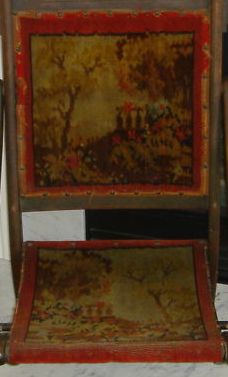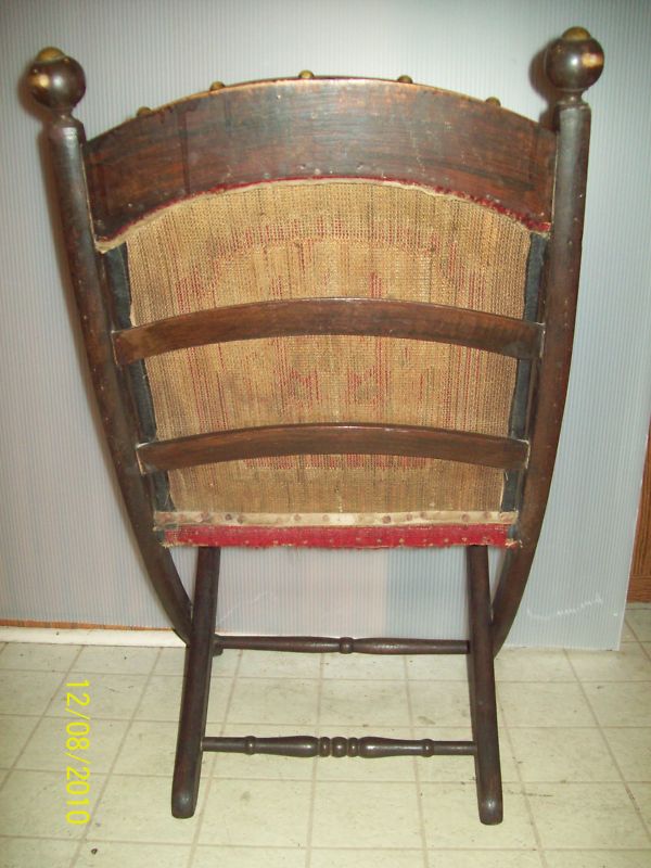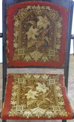 This chair from the New York State Museum, is circa 1866. This walnut chair was made in NYC by B.J. Harrison And Company. The museum’s descriptions is as follows “32 1/2 x 16 x 17 in. Curved crest rail above two side rails ending in molded rear seat rail. Beneath this are two dowels fitted to another molded rail. Oriental-type rug seat (not original).” The seat folds up with a side X pivot while the back folds down. A similar chair construction can be seen in this 1863 Patent.