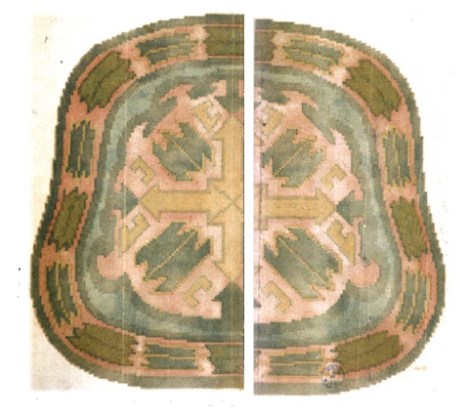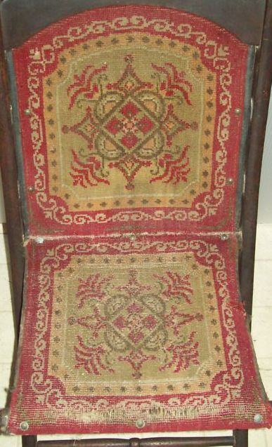 Added March 15th, 2010: A reader contacted me about a chair coming from a private collection. She has been kind enough to share this lovely child’s folding chair which looks much like the one in the photograph above. This chair has a great glowing patina. Notice the darker areas where the chair would have been picked up and carried when folded. The carpet seat is in good condition with deep reds and greens in a large, well centered design. The curves of the legs tend to suggest it was made by someone who worked with Vaill. The back piece is curved nicely while appearing quite solid.
