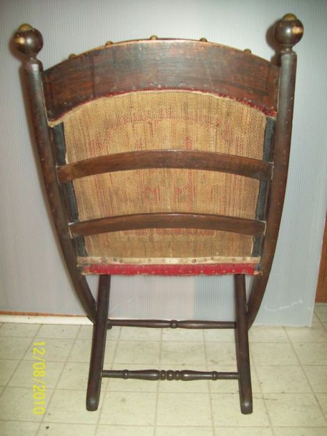 This chair is as it was found. Though nicely intact, the seat and back may not be original. The turning and finials on this chair are quite different then the other chairs seen here. The closest patent I’ve found for dating is this 1881 Patent with a far more complex construction.