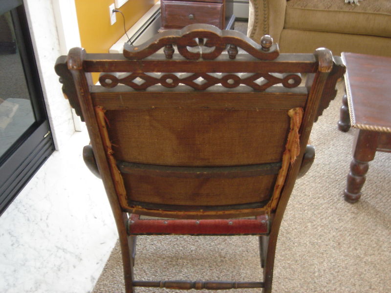 This is my chair, one Dad had for me that was found after he passed. I still have have yet to spend time really looking at this chair. It is an early Eastlake style from the last quarter of the century. The seat material is likely original.