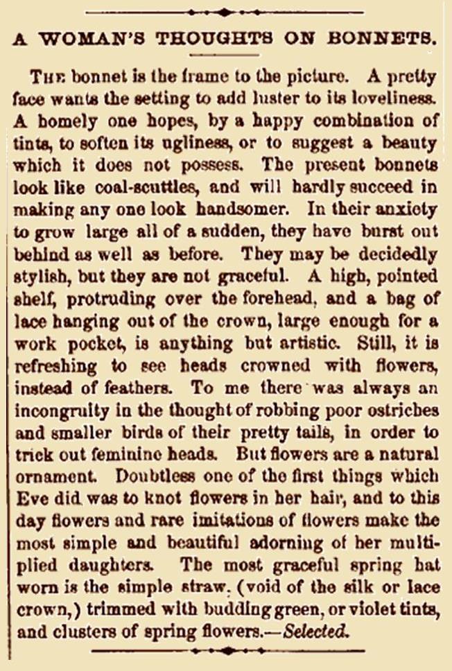 Bonnets still continue very small, with scarcely any curtain at the back. Quantities of tulle are used, and this is a most becoming style. (Peterson’s, October, 1864)