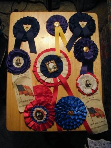 These cockades began with Tom Arliskas’ research for a presentation at the March 2011 Ladies and Gentlemen of the 1860s conference in Harrisburg. Their in-depth research and fine work can be seen as they follow the 150th anniversary cyle from the patriotic cockades supporting both the north and south during the first years of the War through to the 1864 election and then to mourning ribbons upon Lincoln’s death. Each ribbon is based on an original ribbon or period description with great attention to the details of construction. The digital reproductions on the ribbons are incredible.