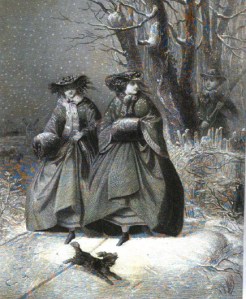In either century, we often find we need to go out and travel in the depths of winter for both necessity and for pleasure. Numerous methods of keeping warm were used to keep warm while in the carriage, sleigh, or wagon.A description of sleighing in the New York Times covers some of the basic clothing for a winter outing. “On with rough coat and warm gloves, thick soled books, and throat wrapper… hire a gallant sleigh; drive round to —-‘s house; receive there a consignment of shawls, wrappers, and buffalo robes, surmounted with a pretty Winter bonnet, relived by the sight of a delicate kid-gloved hand, peeping out from the comfortable mass.” (New York Times January 17, 1853) A Quaker girl from Wheatland, NY used hot bricks to keep warm during an excursion to Bergen. (January 19, 1856) Another suggestion from Eliza Leslie is to use little baskets lined with fur to put your feet in while riding in a carriage or sleigh. (321)