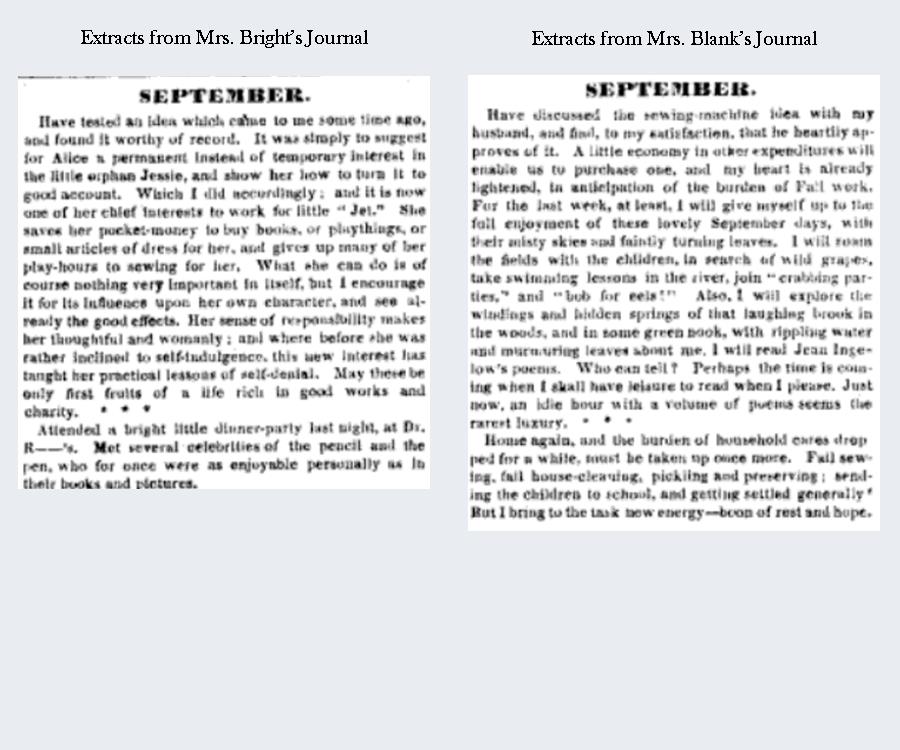 It seems equally reprehensible to follow every varying phrase of fashion, or excite undue notice by the ridiculous outer appearance that must inevitably follow an entire disregard of the prevailing mode. Among the multiplicity of designs, something genteel and pretty can always be selected, which will occupy no more time in making than would the most singular, uncouth costume that could be imagined. I believe it woman’s duty to make herself pleasing, and dress according to the station in which she may be placed; nor do I believe she could perform other more important duties, by a disregard of this. Nor need a person gratifying a fine aesthetic taste by dressing in a becoming robe, necessarily neglect the preparation of the immortal soul for the life to come, more than if poorly clad in somber hues, – any more than one’s a better Christian for wearing such a gloomy, sour, woe-begone visage as to frighten children, and cause them to think religion something terrible.
