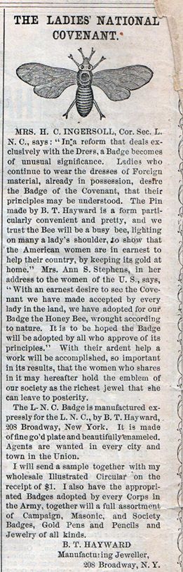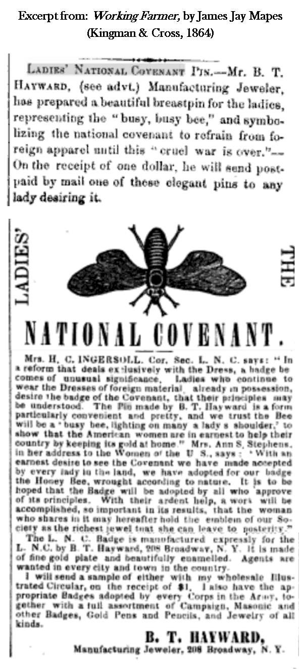 Back in February I shared a couple posts on the Ladies’ National Covenant and the Women’s Patriotic association for Diminishing the use of Imported Luxuries. Elizabeth Topping shared this clip from MMe. Demorest’s Mirror of Fashion, September 1864 regarding the bee being worn in connection with the Covenant.