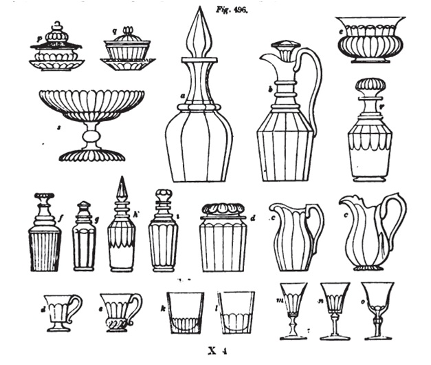 “Glass Used as Table Furniture – The use of glass in furniture is too well known to require much illustration. We shall confine ourselves, therefore, to an enumeration of the various articles in common use. Mirrors have already been mentioned for chandeliers and other holders for lights in Section on Lamps. Glass for the table consists of, decanters for the usual wines, a, fig. 496; ditto for claret, b; liquor bottles, r; water jugs, c, c; pickle glasses, d; finger cups, e; custard cups, d; cruet glasses, f, g, h, I; tumblers, k, l; wine-glasses of various kinds, m, n, o, including those of green glass; butter basins, p, q, s, salad basins, &c.