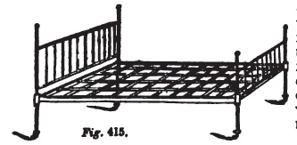 “The folding camp, or tressel bedstead, fig 414, is one of the cheapest made, and has the great convenience of being easily put aside to make room when folded, consisting merely of two frames connected by the sacking. When extended, it is kept open by the head-board, which has two pins that drop into holes in the side rails, with the addition of a foot-board, made in the same manner as the head-board; there is no better bedstead for men servants or young people; and being so moveable, they are easily kept clean, not requiring taking to pieces. They may be had complete for less than [ 1 pound]. If required, nothing would be easier than to add curtains, in the manner of the French bedstead. They are also made sometimes of iron.