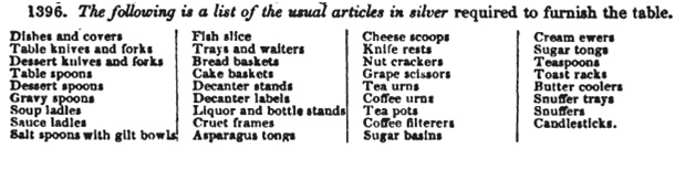 The author discusses silverware, flatware and cutlery extensively with occasional illustration. Those areas are so very detailed, I will not attempt to choose what to clip out. Here is a list of the “Usualy articles in silver required to furnish the table”: