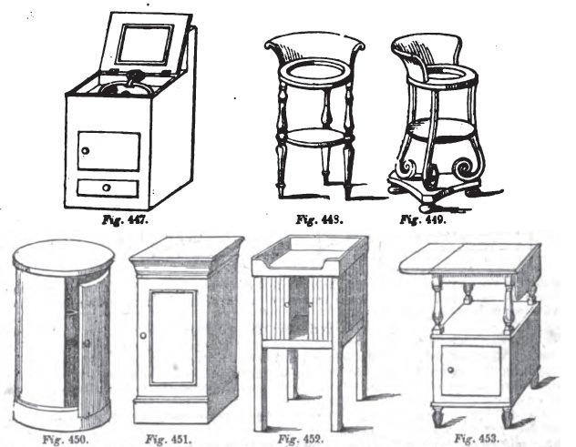 “Portable water-closets are useful where fixed ones cannot be had, and in case of sickness; as they may be placed in a dressing-room, or even a bedroom. If ill constructed, they are a nuisance; butt we can recommend the following , patented by Wiss, near Charing Cross, London. Fig 454, a, a, is the cistern for water, surrounding the three sides of a box which holds the pan, b; the cistern is filled by lifting up a small lid, c, and pulling the handle of an engine, by which the water is forced into the pan through the washer. This water, by its weight, opens the hinged valve at the bottom of the pan, and carries the contents into a pail, e, placed beneath. This pail has a cover with a projection that dips into a groove containing a little water, that effectually prevents any effluvia from coming out. The pail can be removed to empty it. This apparatus many be made in a variety of forms; as a seat, an arm-chair, a commode, settee, &c. The same moveable box, with the cistern and pan, may be used without a pail, and be more complete, where there is the convenience of connecting it with a pipe to go into a drain or cesspool. In this case there is a curved tube, f, to be joined to the pipe, which, being always full of water up to the dotted line, stops any smell from ascending.