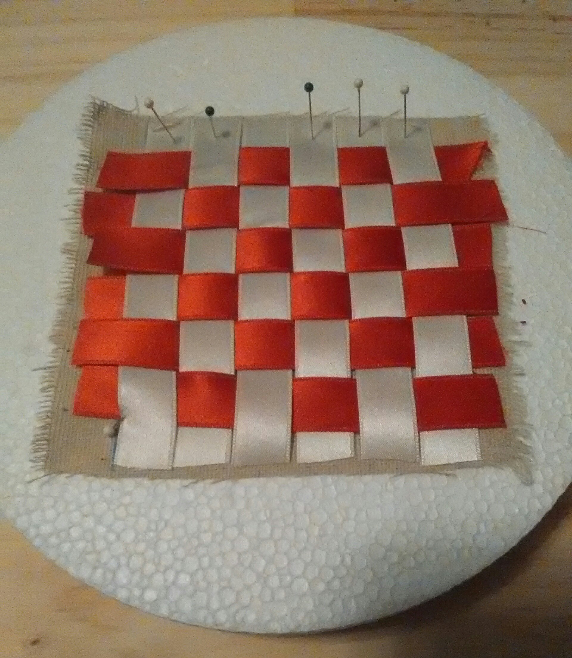 When you have finished weaving, I recommend adding a pin diagonally in each corner, holding the ribbons to the lining. See the bottom left here: