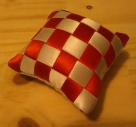 The silk ribbon acts differently than the cotton. No surprise there. This is most apparent while weaving the ribbon. The silk is slipperier and doesn’t want to snug up to it neighbors as well as the cotton. It is lighter weight and possibly less thick, or least less dense then the cotton. This effects how the sides of the cushion sit. I find the silk makes a smoother edge than the cotton, which can have more fullness. I suspect the cotton would wear better over many repeated pin stickings as the weave of the ribbon itself is tighter. I can’t say that I like one over the other though. Each has its own advantages.