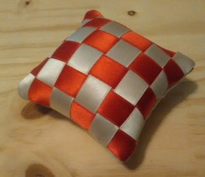 These pretty pin cushions combine two ribbons woven together either square on the cushion or on the diagonal. The ribbons are most often in contrasting colors, though not always.