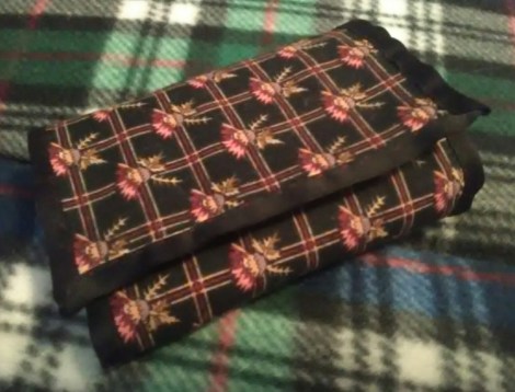 To the right is a sampling trio of hollow sewing cases. The top is the accompanying illustration for a housewife published in Peterson’s Magazine in 1862, Arthur’s Home Magazine in December of 1863, August 1864, and Godey’s Lady’s Book in 1864 (directions follow). The bottom left is an undated sewing case of similar construction that I suspect is late 19th century based on the sewing and accompanying advertisement. (The image in Pinterest links only to a Flicker account that I have not been able to find the original image or location in.) To the right is another broken Pinterest link. This one is noted as an early twentieth century example attributed to Shakers. The use of this material can be found earlier. The seams appear to be hand sewn.