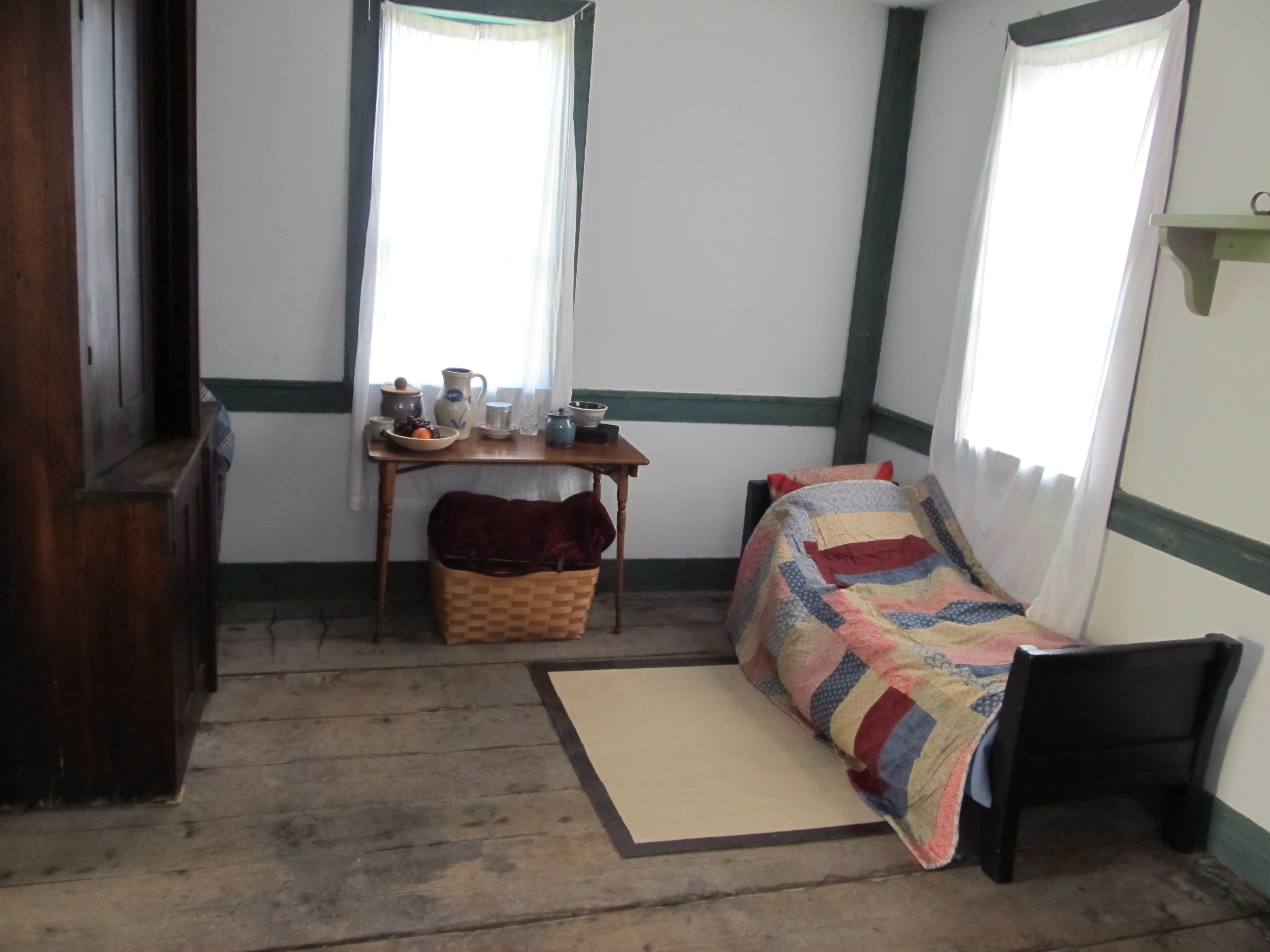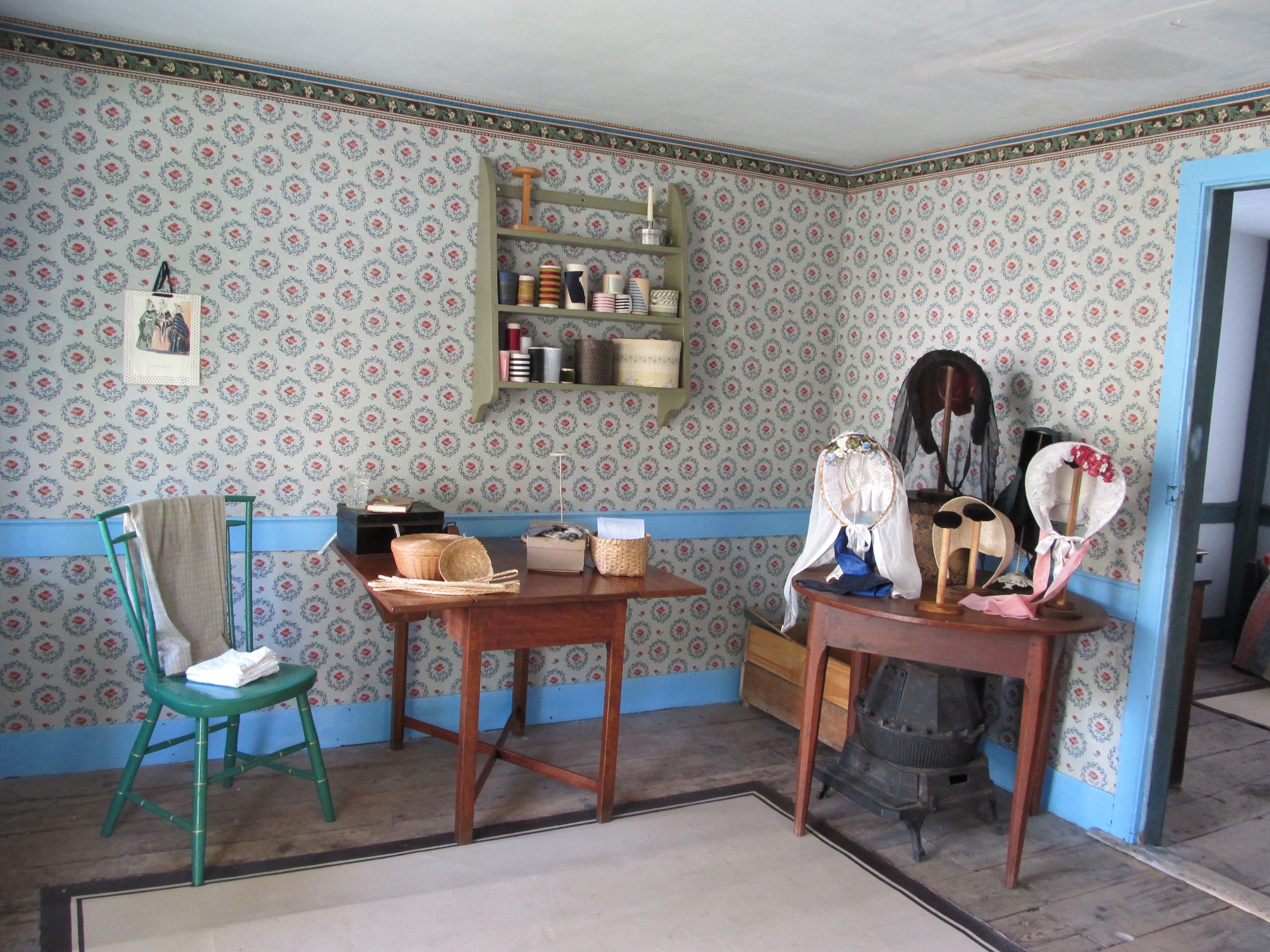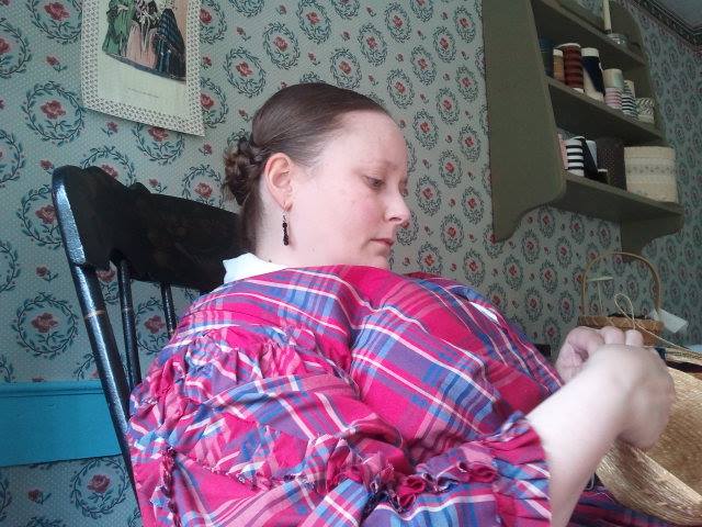 This was my second year in the Dressmaker’s Shop at the Genesee Country Village for their Civil War Encampment. As you can see Saturday morning was pleasant and sunny. You can also see the soldiers struck camp right up to my back door. While I was thinking this might make for some fun interaction, after-all I was prepared to say all my firewood was stollen as well as my wooden head forms. But, in the end, they kept to themselves. Well, except for eating all the beautiful black raspberries I was eyeing the night before.