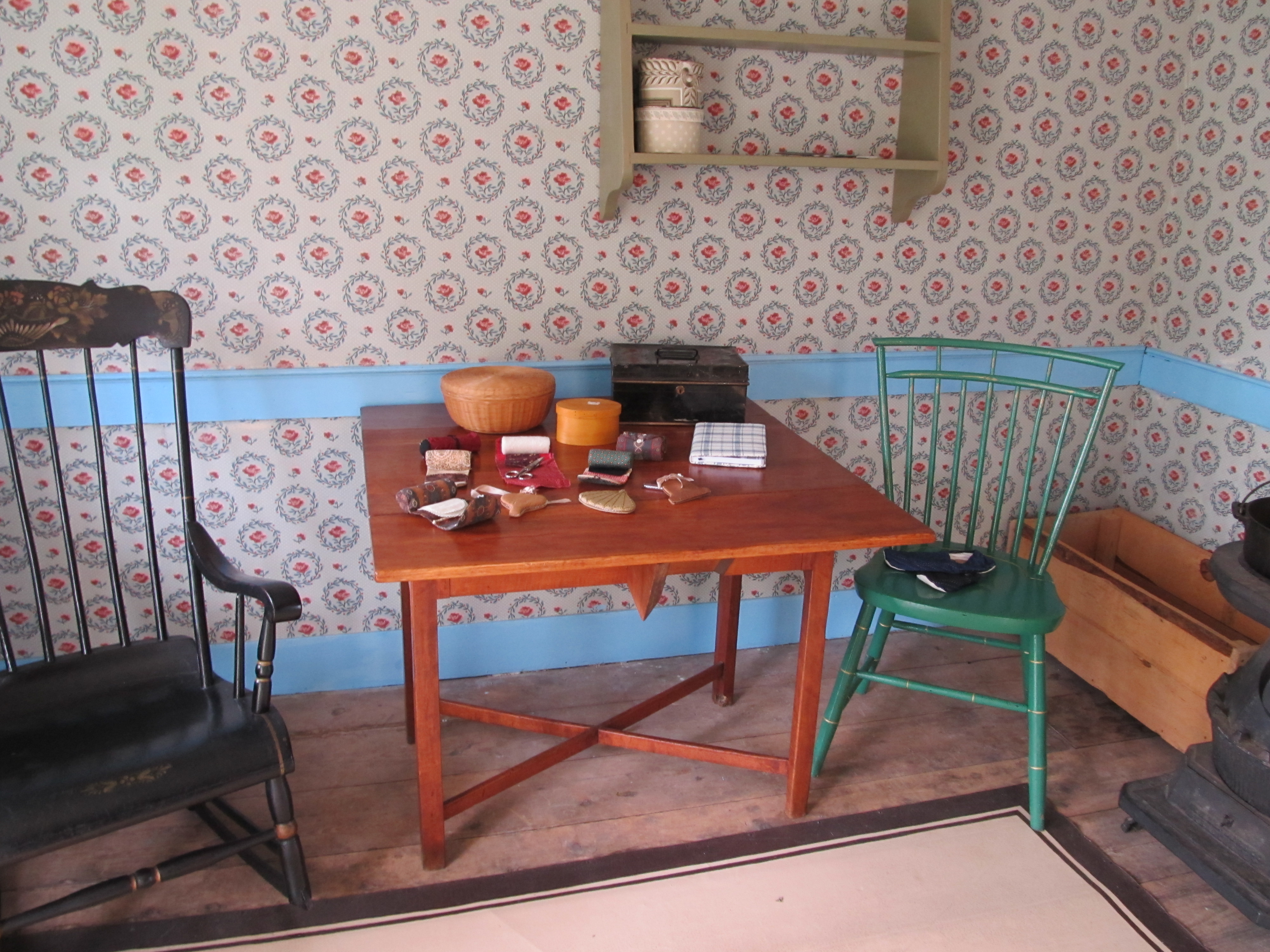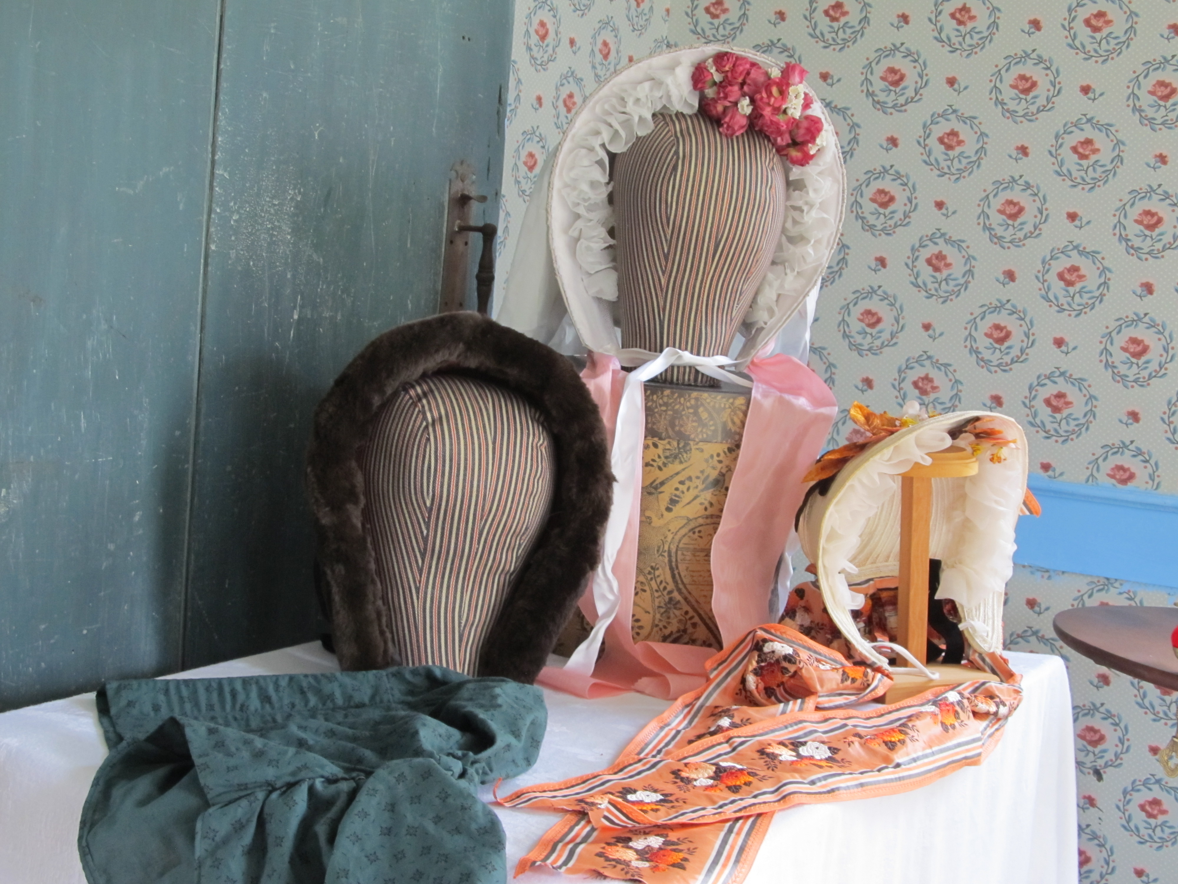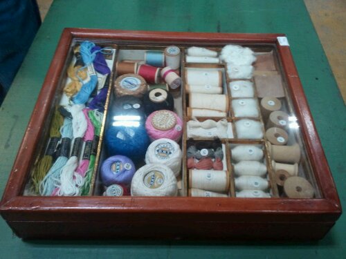 The ideas this case sparks makes me want to find a similarly sized case. I am envisioning a millinery materials display with neatly rolled/coiled and numbered pieces inside. This could include structural materials and decorative materials. Hmmm, maybe two cases; one for structural and one for decorative. I would want to show the different types of ribbons as well as the silk. Those could take up a lot of space. It would bee so convenient to have such display cases together for talking with guests.