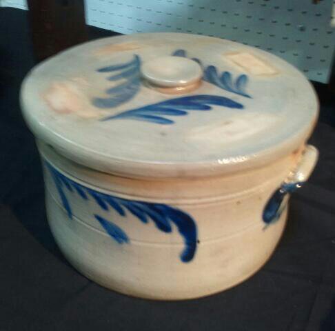 This is a crock I hadn’t seen in person before. It is a cake crock. At first glance, my thoughts were “no? really?”. Then I remembered the price listings in the book I gave mom for Christmas last year. Those had cake crocks. This was very neat. I would say this is between 10″ and 12″ across.