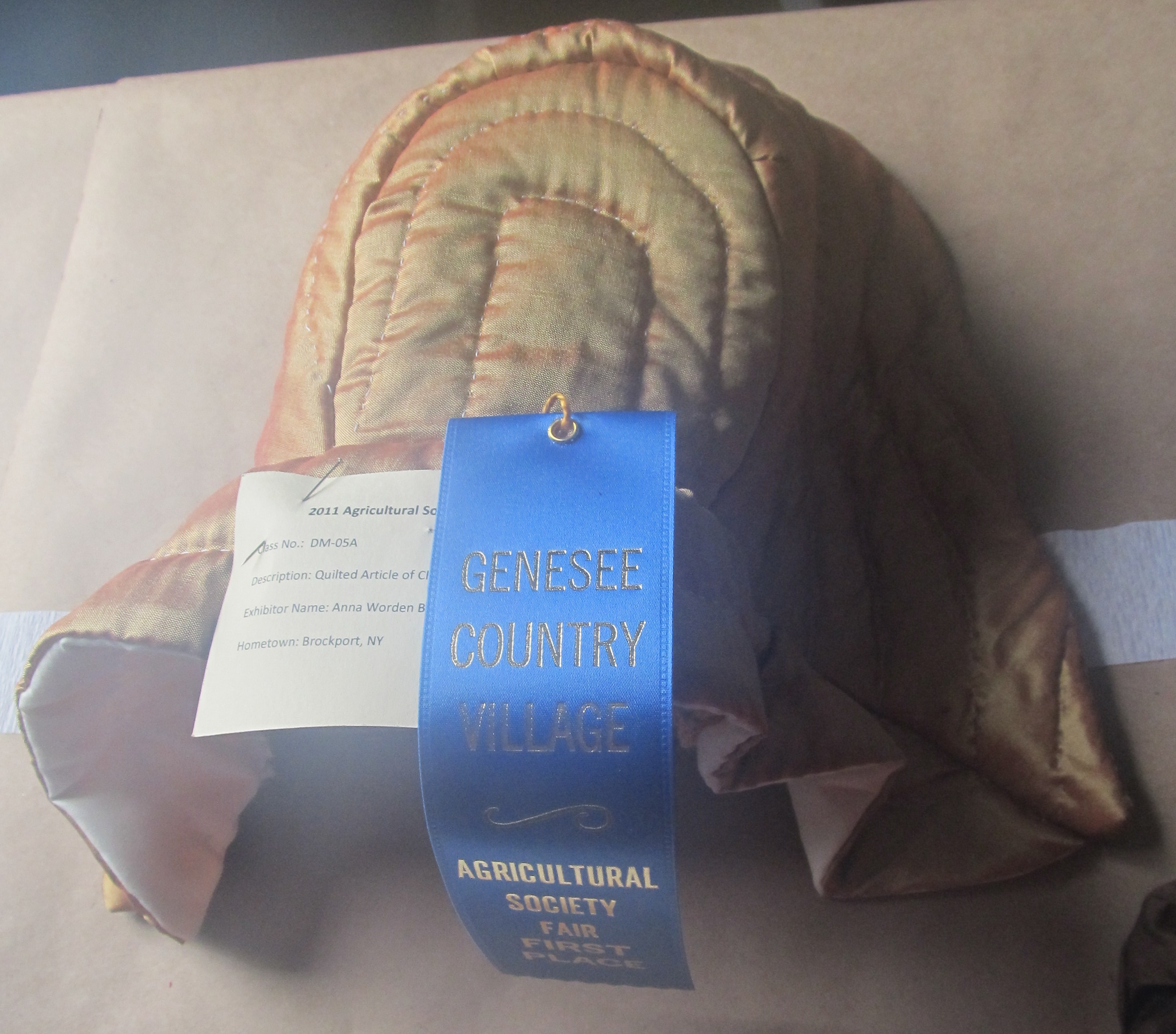 This is the sunset silk quilted hood. It won a blue ribbon in the 19th century quilted article of clothing class.