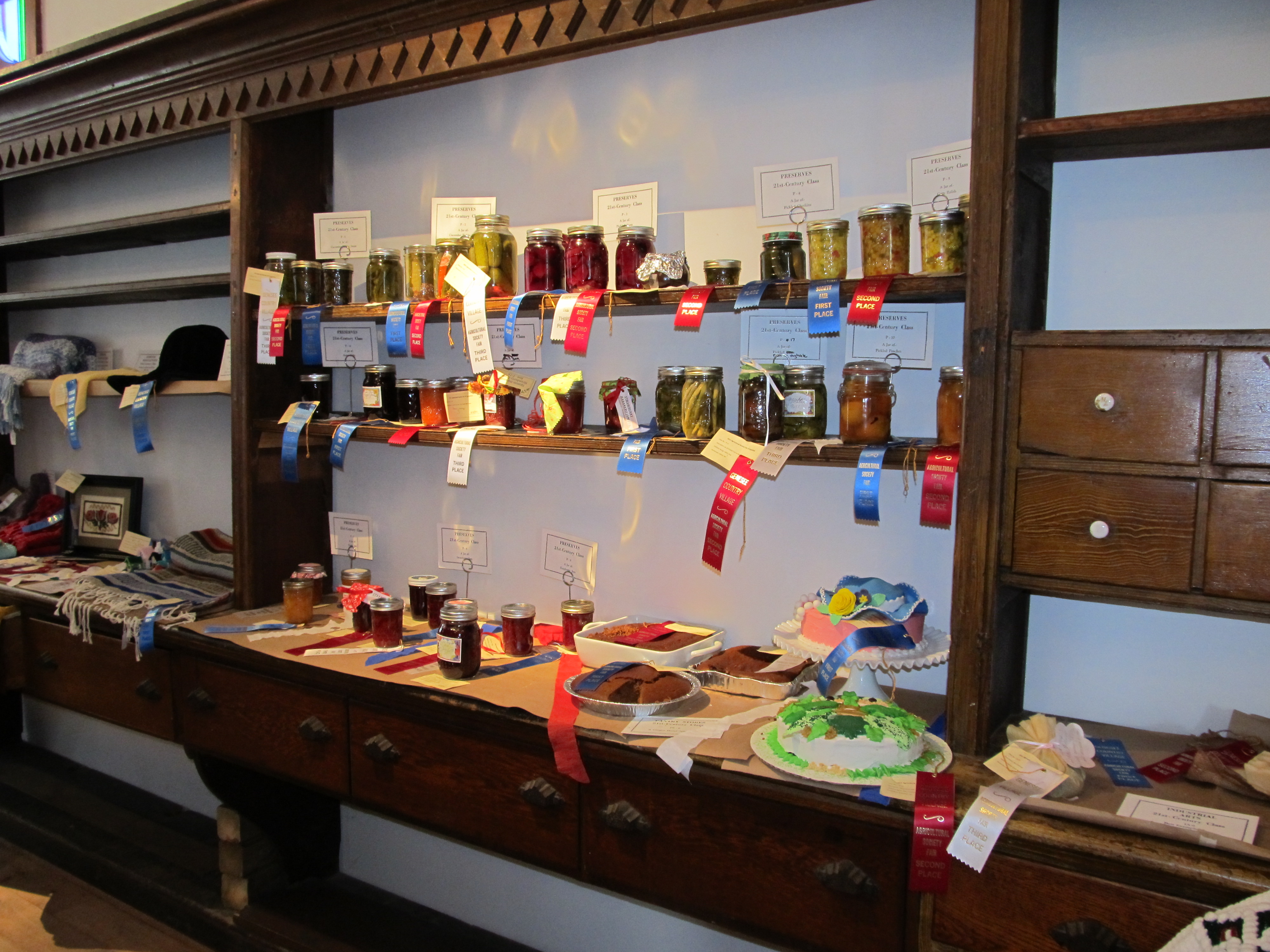 This is one of I think 9 canned foods mom entered. She got ribbons for a few jams, sweet pickles and beets. (I hope I got that right. I was a bit too short to see the labels on the top shelf.) The photo below shows the display of 21st century canning entries.