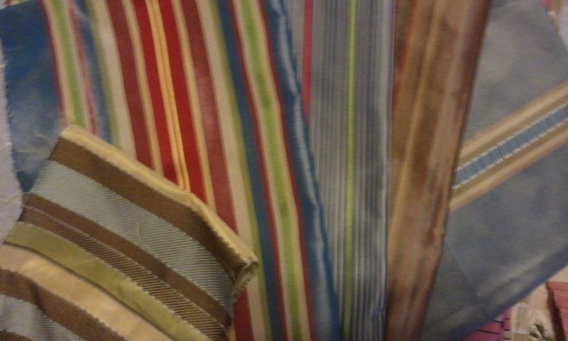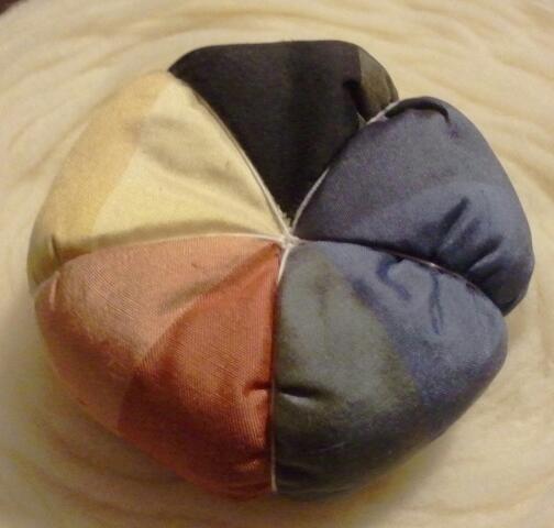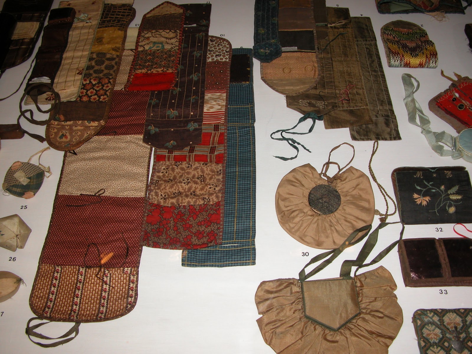Original work pockets, made of a row of pockets which roll up, can be found spanning from the 18th century through the 19th century. Their pockets held numerous sewing needs, nicely organized. Some pockets were made with various prints of a single color or shade such as this Turkey red example or this blue example. Other pockets used an assortment of prints, stripes and plaids. This example used a plaid, print and check for the pockets. The size of the pockets varied through time as well. On the left hand side of this photo, you can see many different sizes.