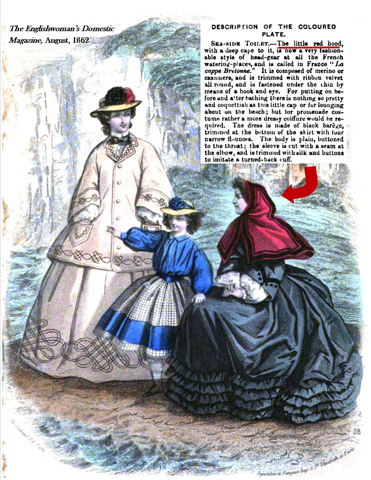 So, I’m scrolling along…. I see… Ooo, a hood. Zoom…. Odd combination a hood and straw hats…. hmmmm…. Scroll up… read…. “Sea-side Toilet. – The little red hood, with a deep cape”… Wait, What??? …..”Sea-side Toilet. – The little red hood, with a deep cape to it is now a very fashionable style of head-gear at all the French watering-places, and it is called in France “Le cappe Bretonne.”…. Scroll down… scroll up… repeat… reread… yep, that is what it says… brain implosion!!!