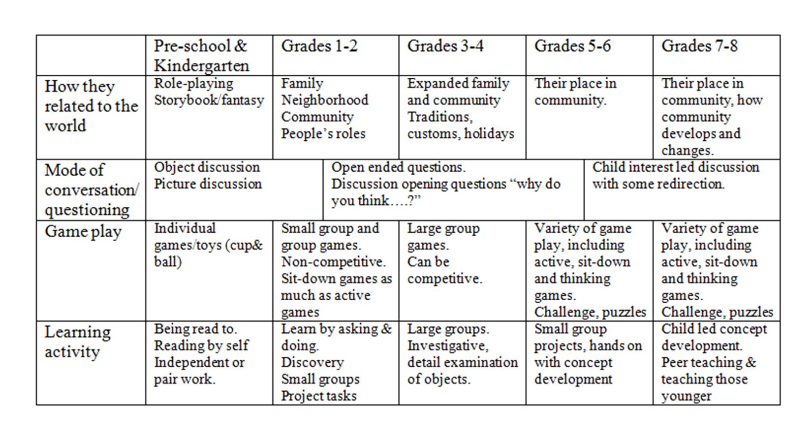 When engaging children keep in mind learning styles and interests vary according to a child’s personal learning style and age. This chart gives a brief outline: