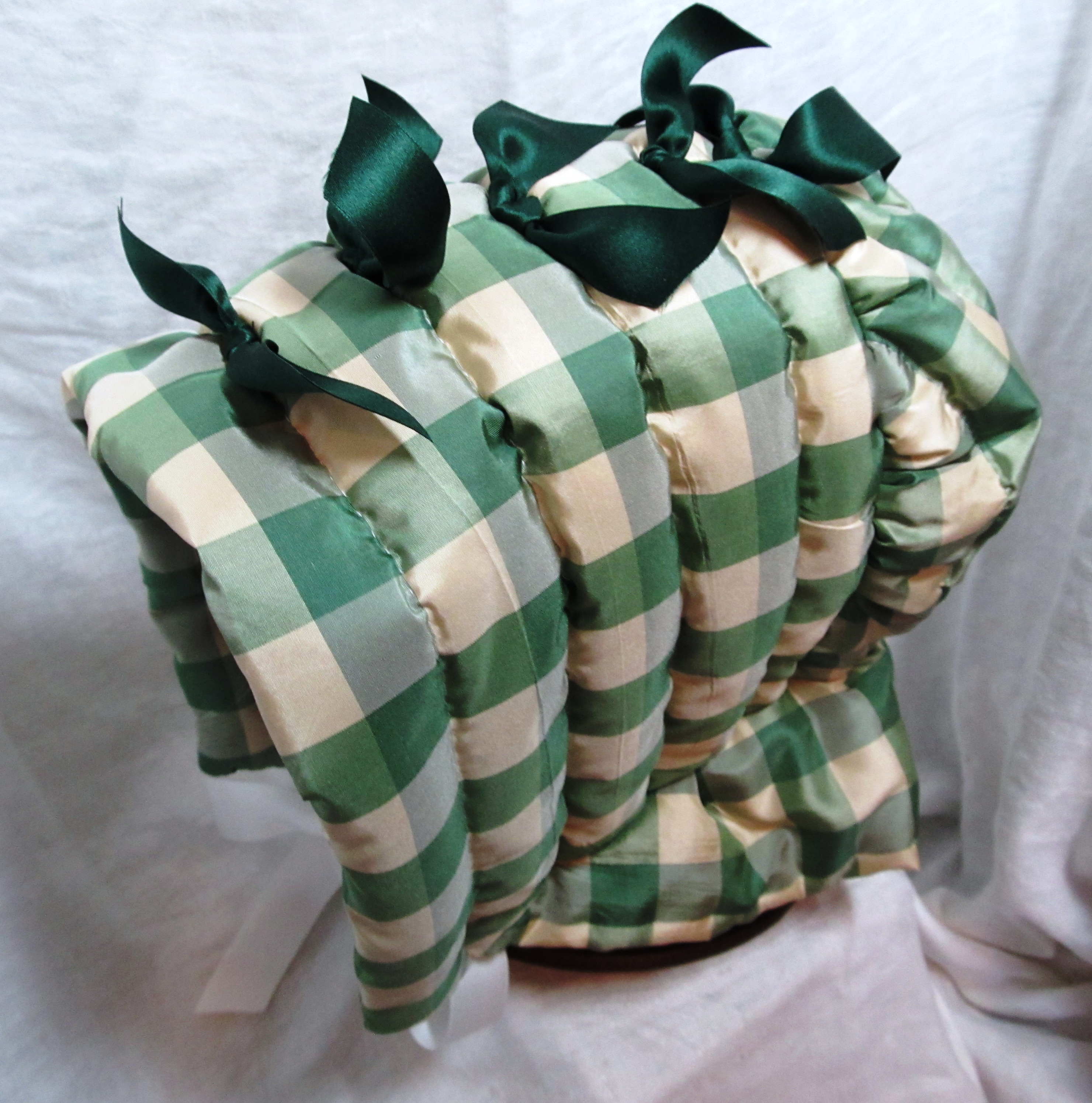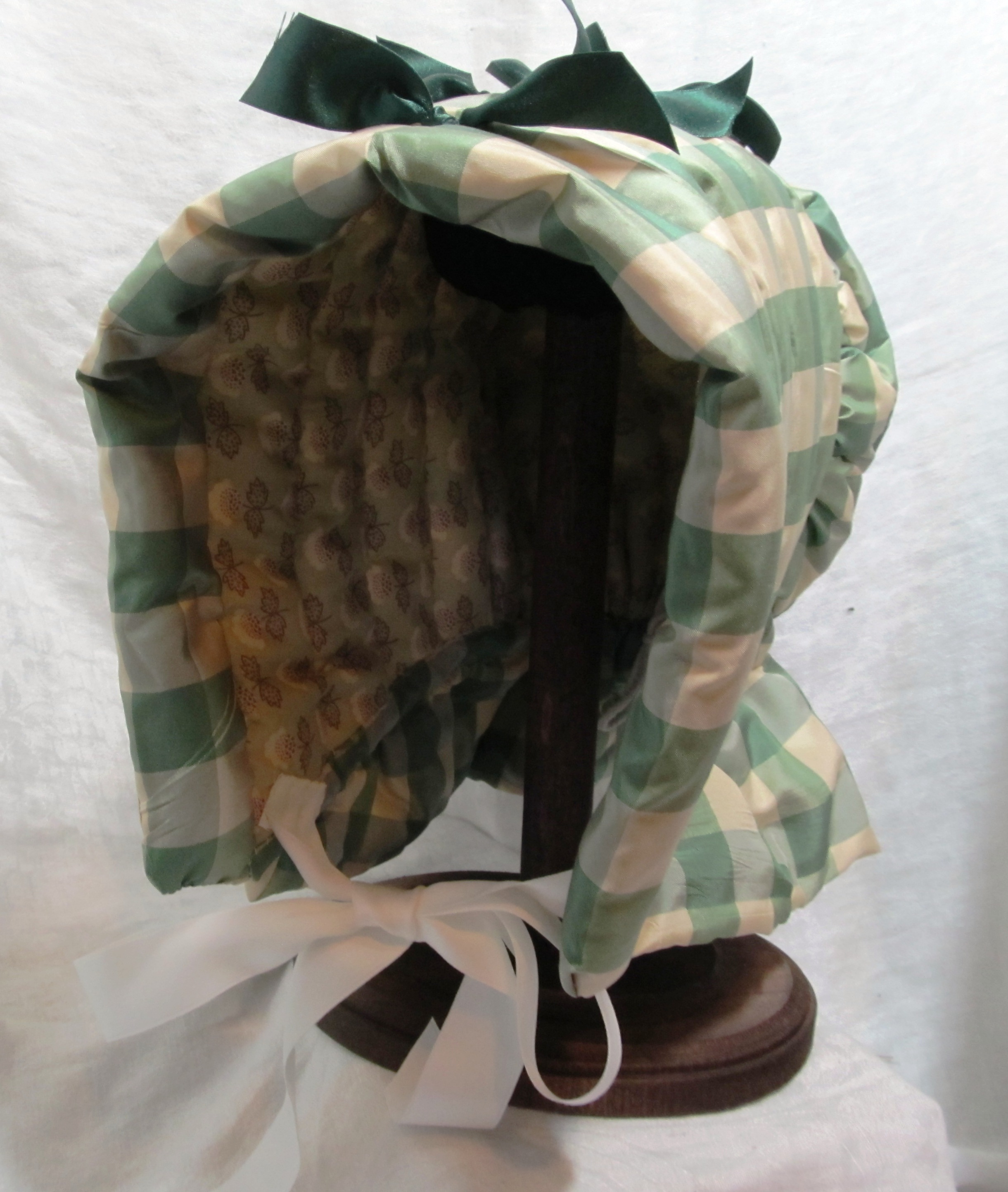 Winter wear in a pretty green and cream silk trimmed with dark green silk ribbons. The wide lofts filled with squishy wool are quilted along the lines of the check. The double layer of wool batting makes this hood soft and warm. The full crown gives plenty of room for your coiffure. It is also adjustable along the neckline.