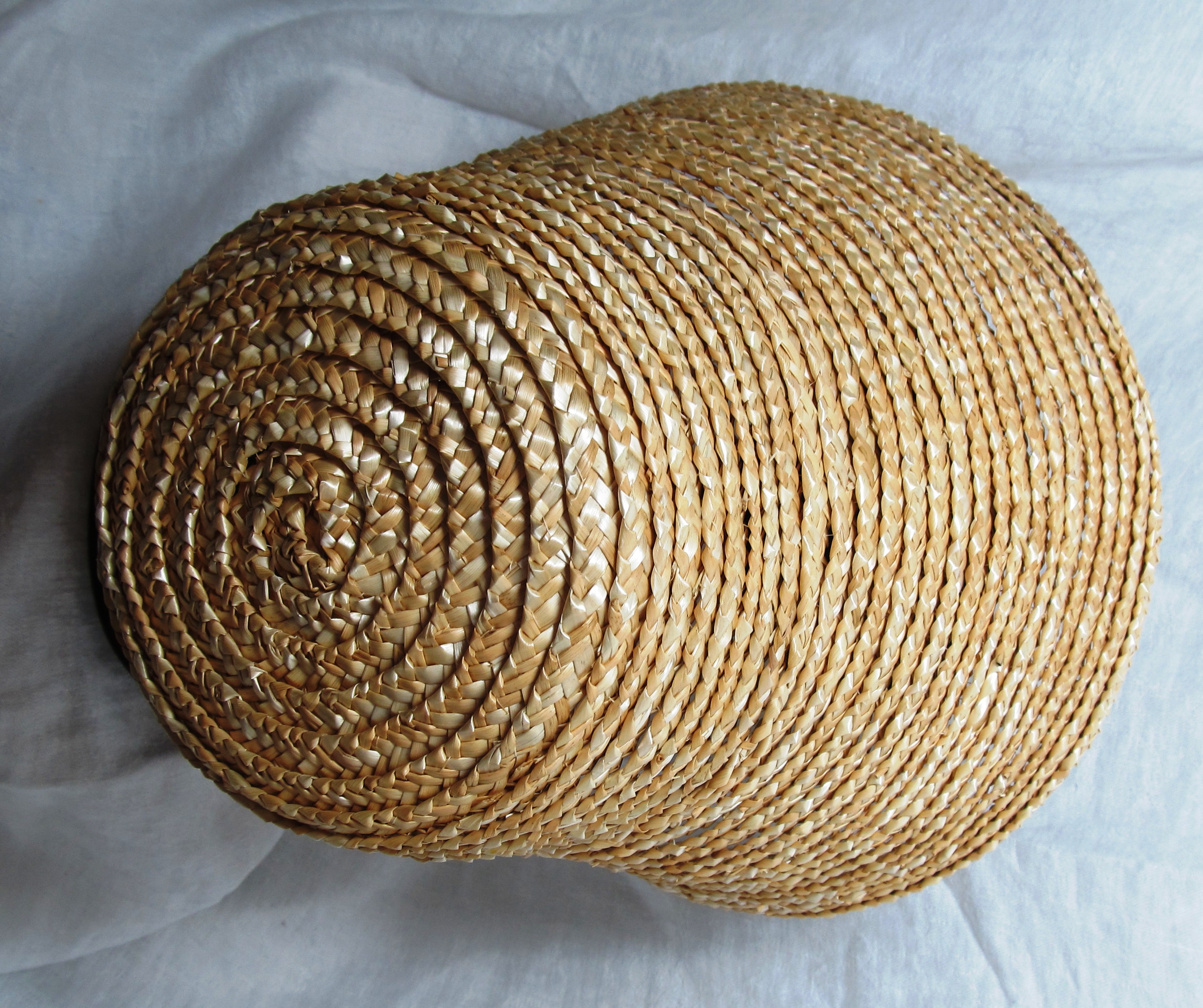 This is a bonnet I had to very quickly make overnight from what straw I could find. The shape is very loose and flat. This stay holds it on rather well.