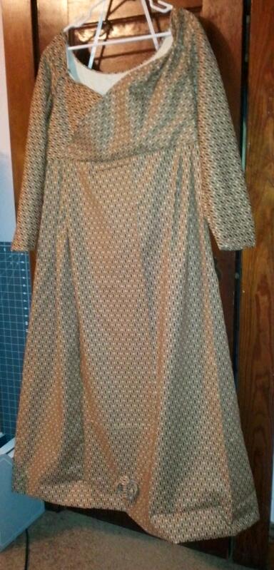 On Saturday evening I had it in my head I needed a dress for the museum’s upcoming 1812 event. I had a two piece (sacque and petti or shortgown and petti) combination in my head. The shortgown was a crossover front and fitted back. The cabinet offered a couple options – the plaids were out, the paisley is reserved – the brown sorta stripe ovally motif was the fabric. (In my head is still has a blue in it.) By morning, I wanted to make the dress. As the day progressed wandering the historic village the want/need of an early teens dress evolved into a want of a late teens to early twenties dress. Ideas of one pieces vs two piece, earlier vs later, with or without the crossover jumbled around in my head cooking in the sun. By 1 am when I had a toothache (um late 30s, why is that wisdom tooth moving???) the dress was distinctly a single piece, crossover bodice 1820 dress.