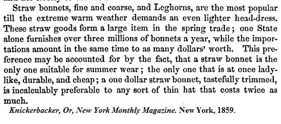There seem to be two sets of answers, one based on time – That prior to approx 1850 coarse straw bonnets appear in mentions of fashion with the height in the 1830s (roughly). These mentions reference coarse straw for morning wear with simple adornment of only ribbons. As we reach further into the 1840s the mentions switch to saying this practice is falling out of fashion. By the 50s, 1851 actually, these mentions seem to disappear. Coarse straw bonnets 1831