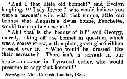 In this work of fiction, Everley, a women of wealth dresses like a servant, the straw bonnet being discussed as key to the attire. Coarse straw bonnets for servants 1855