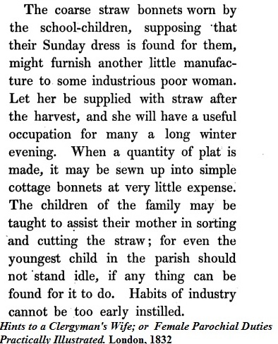 This excerpt recommends supplying poor families with straw so the mothers may make bonnets for the school children: