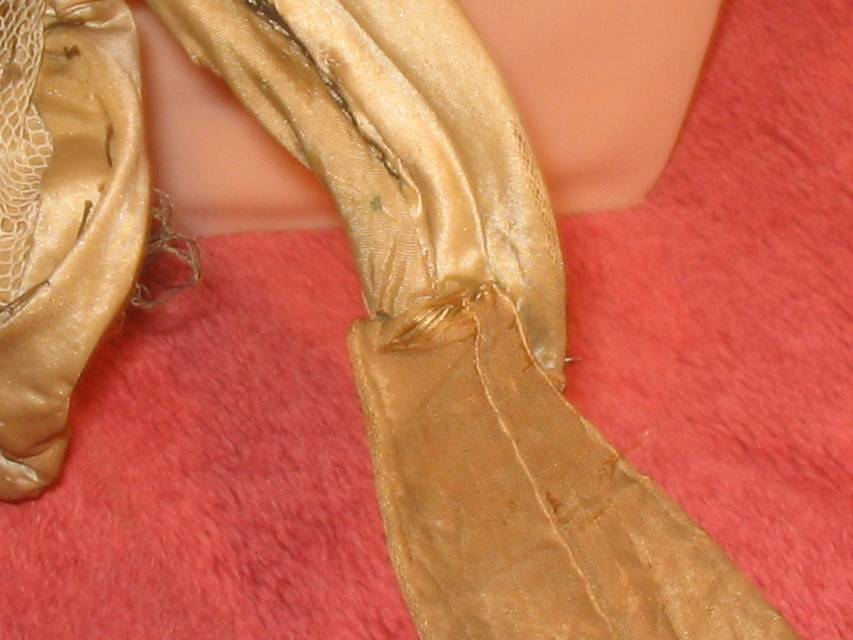This example of Pam Robles shows the utility tie on the very end of the cheektab with the decorative ribbon over it. The remains of the utility tie can be seen at the very end of the tip on the inside with the decorative ribbon folded and attached over top of it. This would put the stress of holding the bonnet on the utility ties while minimizing the wear on the decorative ribbon.