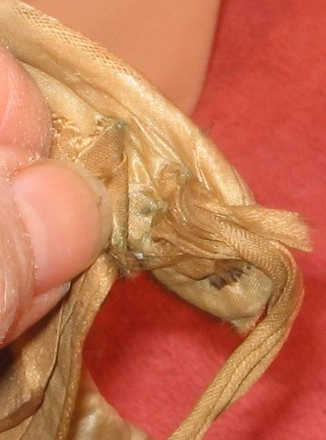 This example from the Henry Ford Museum shows the utility tie on the very end of the cheektab on the outside with the decorative ribbon over it. Please click on the image thumbnail to link to the Henry Ford Museum and additional photos. Zoom in on the right cheektab to see the remnants of the original utility tie.