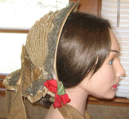 This 1840s/1850s example shows the utility ties on the inside cheek tab with the decorative ribbon on the outside. In this arrangement, the utility ties position varies along the cheektab. This example has the utility ties placed higher inside the cheektab. The wider decorative ribbon is neatly folded and attached further down on the outside of the cheektab. Please click on the thumbnail to link to the original posting and additional photos.