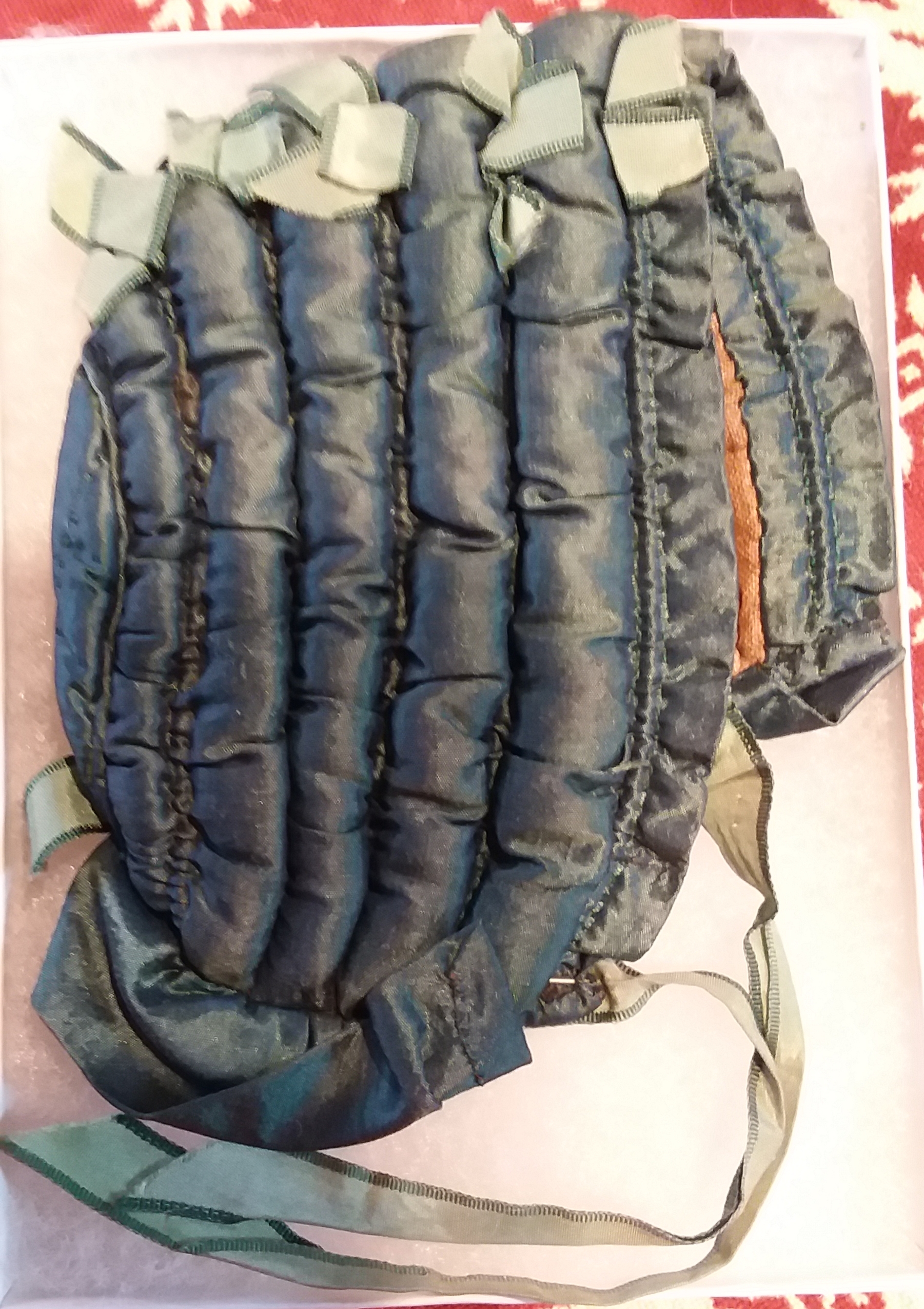 Quilted winter hood with larger crown full at the top and wired brim edge. I theorize this bonnet was worn in the 1820s or 30s. When it arrived, it was obvious it had been stored flat for many decades with the brim and crown misshapen. I’ve slowly been adding support to the crown and brim to reveal its original full shape.