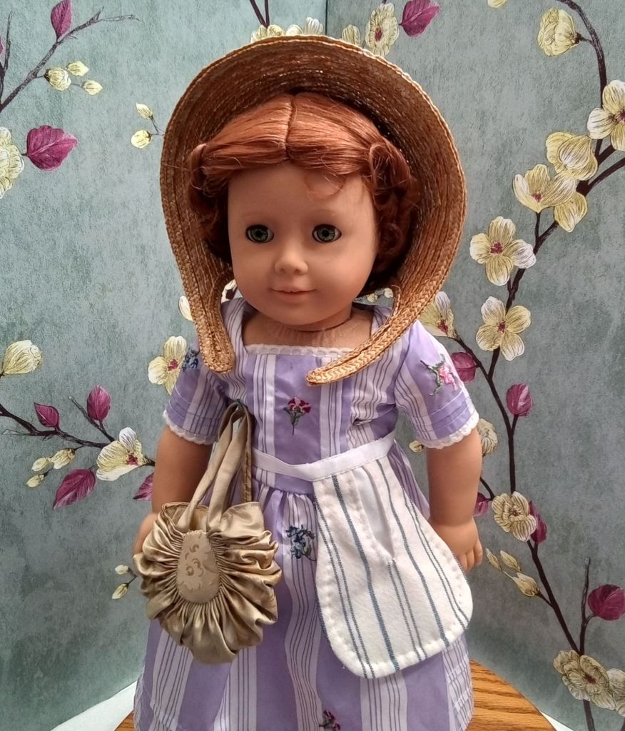 The final set from today is model by a popular modern doll who also stand 18″ tall with a head measuring approximately 13″ around. She shows off a trio that includes a straw bonnet, silk workbag, and cotton pocket. The bonnet is a high brim straw bonnet appropriatefor the late 1850s through early 1860s. The workbag is silk with pasteboard centers. itnis a style seen through out the century. The pocket is an Heirloom Family Weavers cotton. The pocket is lined with cotton sateen ribbon for the ties.