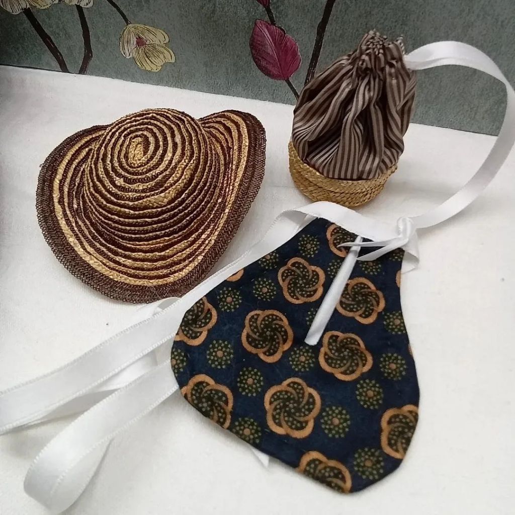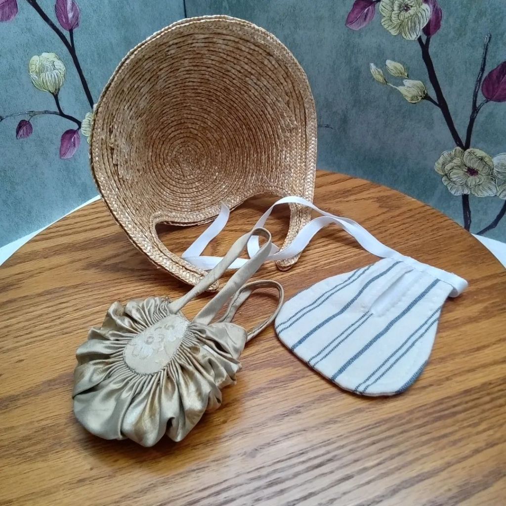Violet is modeling two sets. Violet is a reproduction doll with a Jenny Lind hairstyle. She stands 18″ tall, while her head measure 8.25″ around. There are three pieces in each set she models. Each trio includes a straw hat, straw and silk workbag, and cotton pocket. The fashionably shapped straw hat is made with straw plait and brown, faux horsehair plait. It is block firm, without wire. The workbag has a straw base and silk bag, which draws closed with a ribbon. The bag is lined but the straw is not. The pocket is cotton in a mid-nineteenth century appropriate print. The pocket is lined with cotton sateen ribbon for the ties.