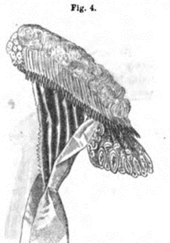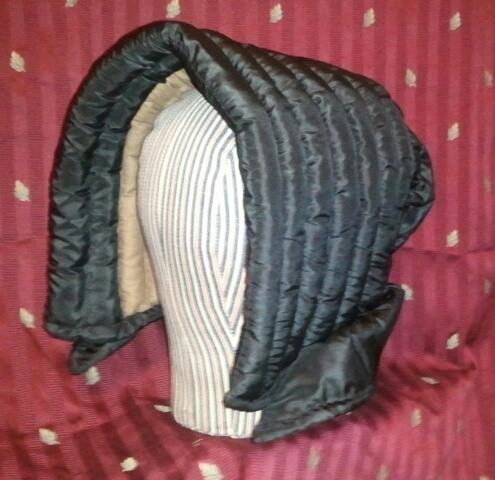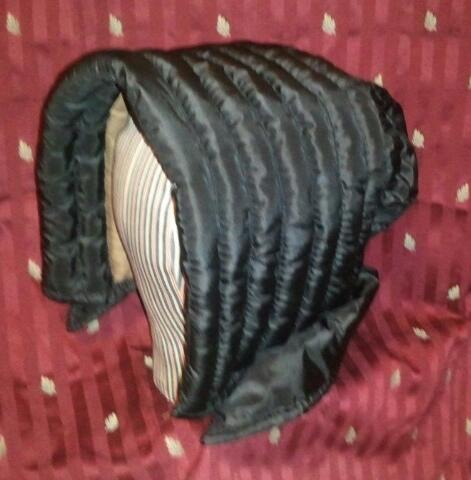 Godey’s Lady’s Book, 1866 “Empire Bonnet. Intended for a half mourning toilet. The border in front and the curtain consist of white chip, the crown is formed of black thulle puffings, the puffings being separated by rows of black ribbon velvet, worked with white chalk beads. Black velvet ribbon, with a row of white beads on the centre, separates the front from the crown. The bow at the back consists of black velvet and beads; the strings are black velvet. In the inside is a black velvet bandelet, worked with white beads. If this bonnet is preferred in colors, blue silk and crystal beads might be substituted for the black thulle and chalk beads. Mauve silk, with straw drops, would likewise have a good effect.