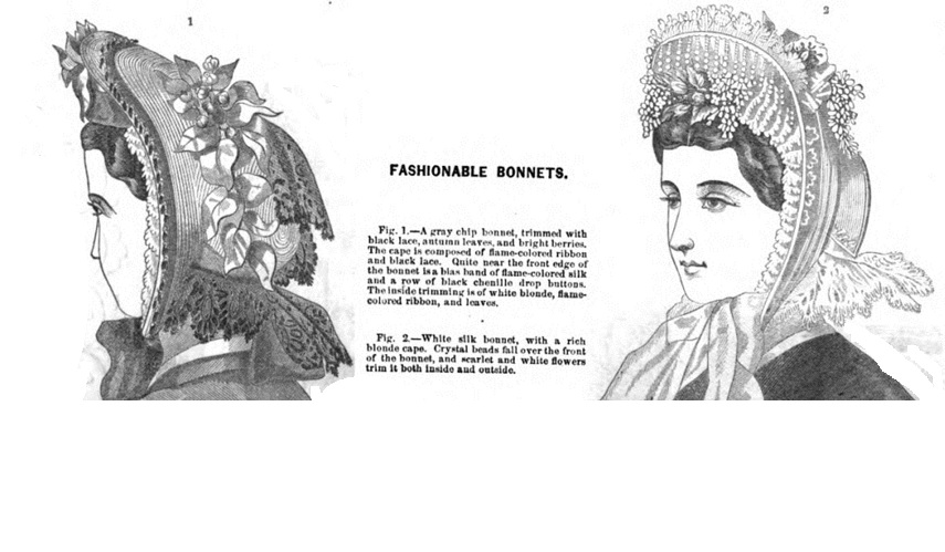 In 1865, mentions of the Empire bonnet are in fashion descriptions with a line or two regarding an ensemble rather than commentary on the style itself.