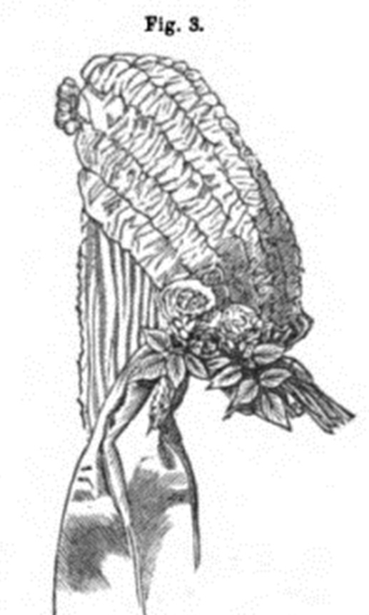 “Empire bonnet (front and back view). It is of rice straw, trimmed with a large turf of pink roses mixed with black feathers. The bonnet is edged with a pearl fringe, and strings are of black ribbon” (Godey’s Lady’s Book, November 1865)