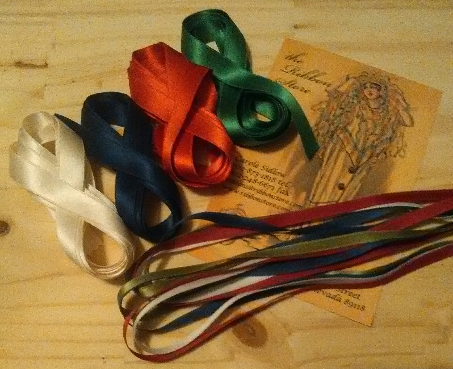 While working on the cotton sateen examples, I had Carole at The Ribbon Store looking for silk ribbons and narrower cotton sateen ribbons. I wanted seasonal colors because I had a secondary idea in mind. She came up with a nice color assortment.