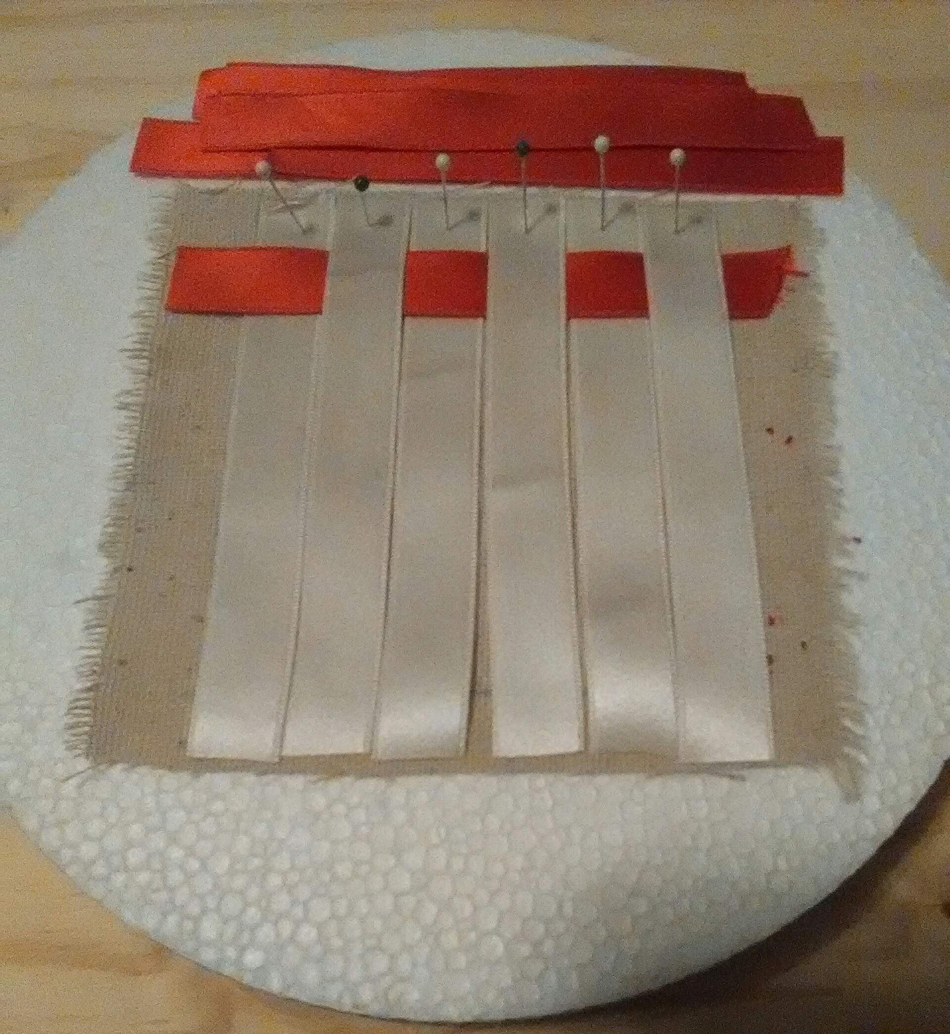 For the first few I made, I used the half inch cotton sateen ribbon from The Ribbon Store. I like the body and weave of this ribbon as well as its density of color. I found this ribbon was very easy to work with in this project because it was easy to weave, staying in place without flopping around, and had strong edges without fraying. I used a foam circle as a platform to pin and weave the ribbons on. Woven, the ribbons formed a roughly 3″ square. I basted the woven ribbons, at the cut ends, to a 4″ osenburg foundation. (I accidentally deleted these photos as I went to upload them. Sorry.) I used some ivory wool for the back. I had wanted to use a firm white silk taffeta. But, I can not figure out where I put that.