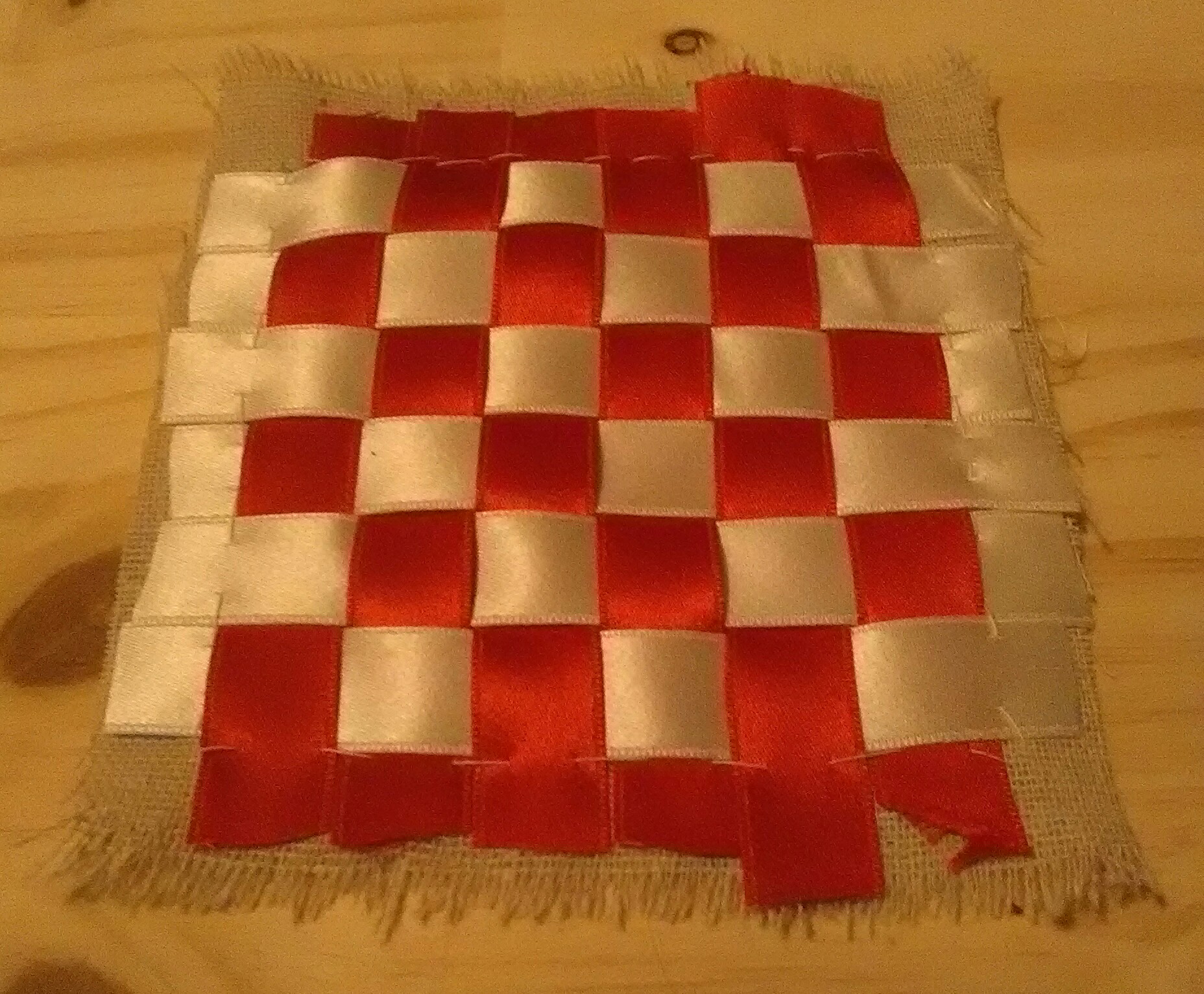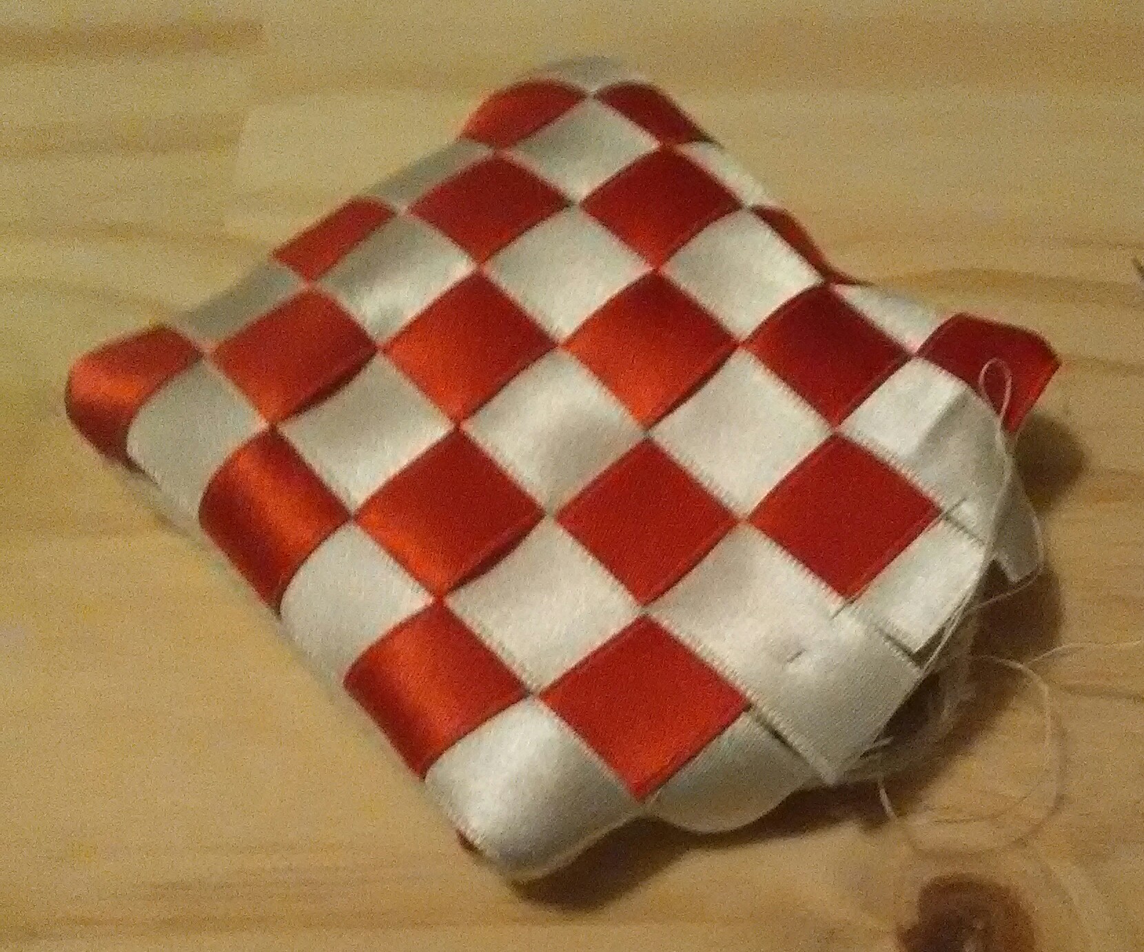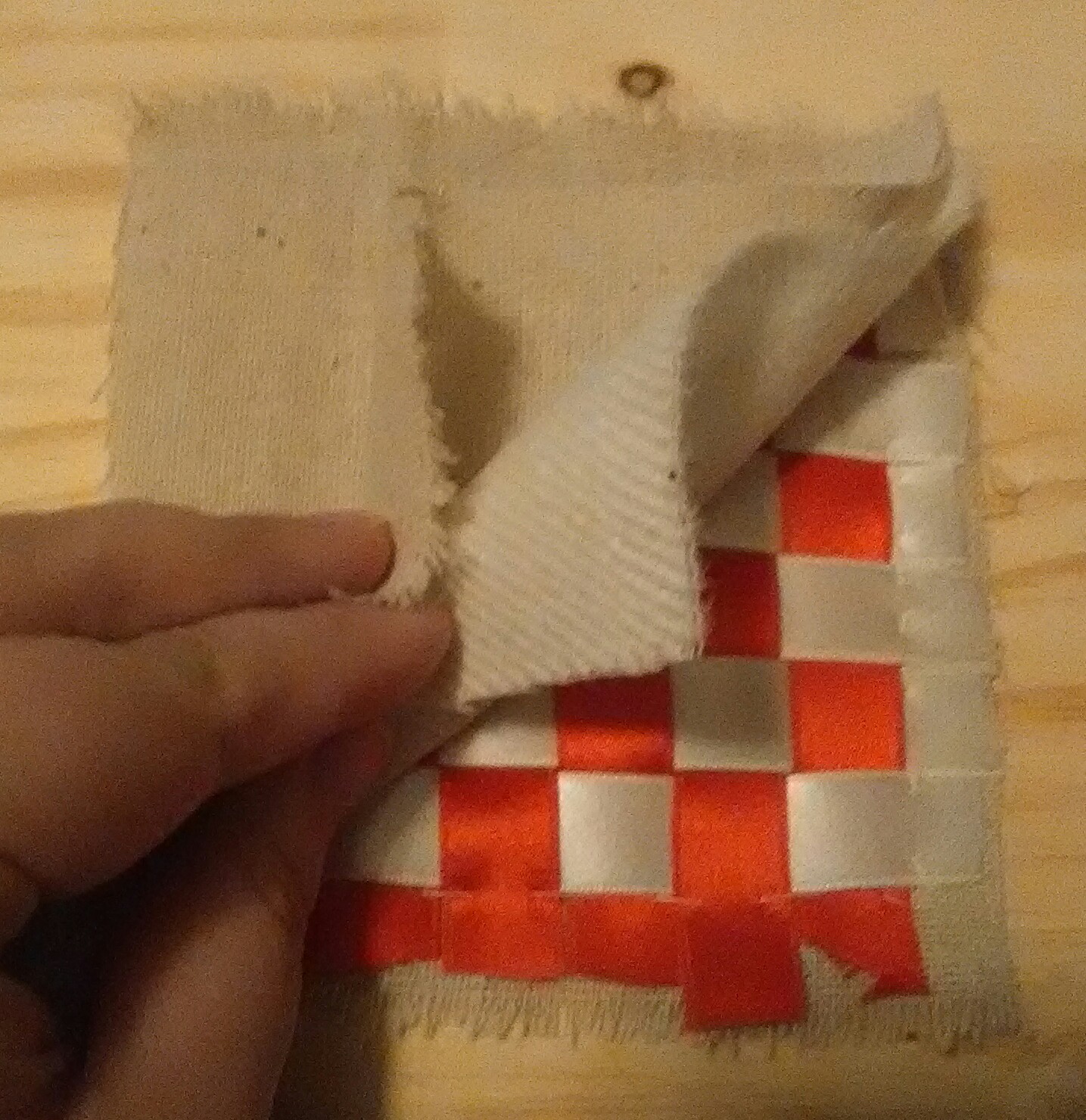 When you have finished weaving, I recommend adding a pin diagonally in each corner, holding the ribbons to the lining. See the bottom left here:
