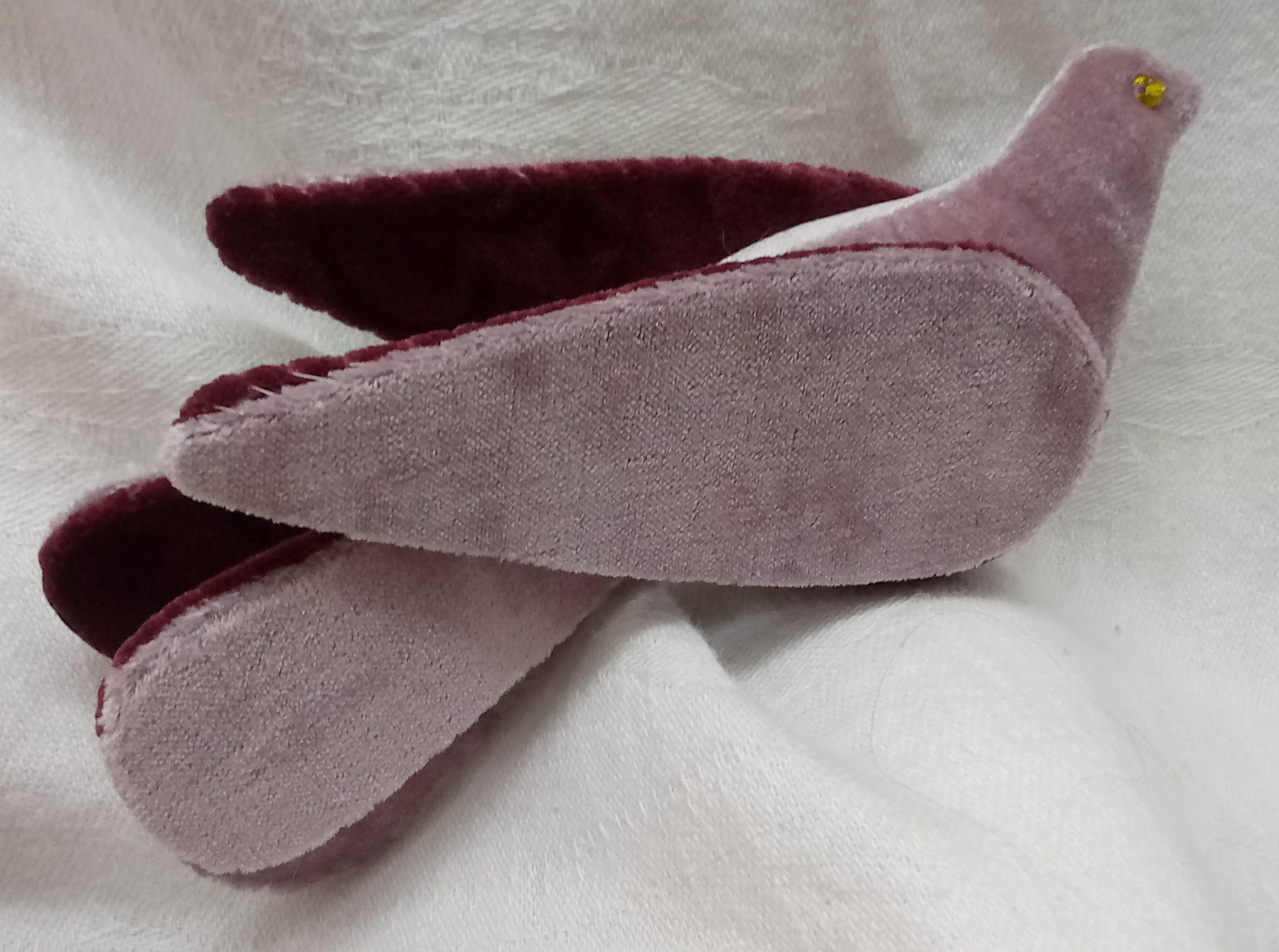 Today’s project is a sweet velvet bird ornament inspired by an original pincushion I saw on Ebay a few years ago that was too far out of my reach. Since then, Gleekruger shared a similar original velvet bird pinkeep on Instagram. This one was made with brown and cream velvets.