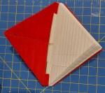I covered the pasteboard cover with red velvet. In doing so, I folded each side in to the wrong side about an inch, down to the corners of the cover. The four corners of the created rectangle fold down over the sides of the cover. This put folded edges close together to be sewn snug onto the pasteboard. I did this from memory of the book as it is pack away. After completion, I found these folds overlap on the original rather than come together. While this does give more complete coverage, it also creates more bulk, which my mimic lacks.