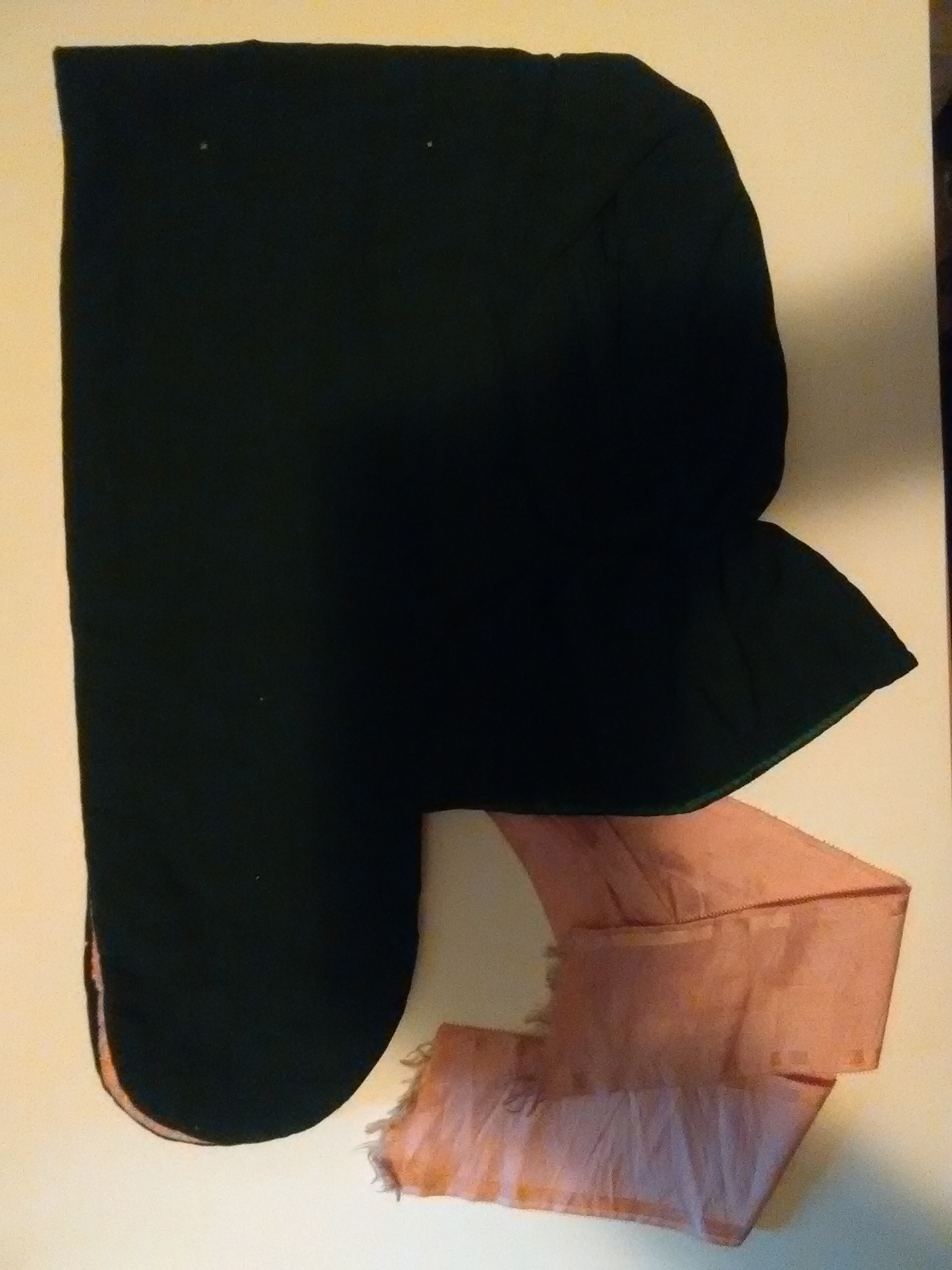 This next hood is a two piece construction: a combined brim/crown piece and a bavolet. Notice the bavolet length is on the longer side compared with other styles of winter hoods. This hood had the same green with pink color combination as the one above, but the exterior and interior are both silk.