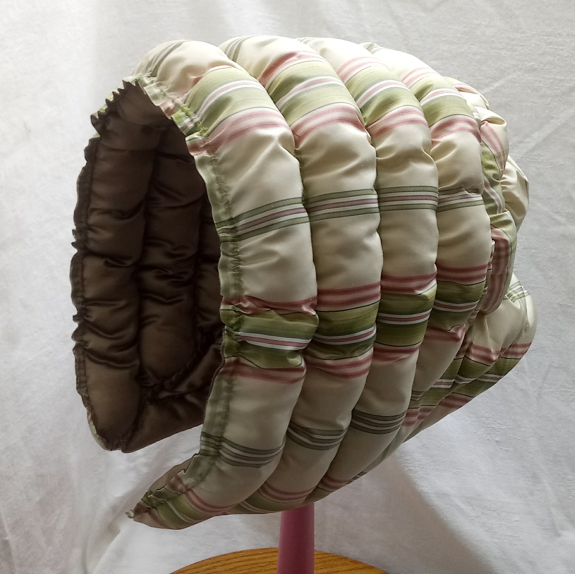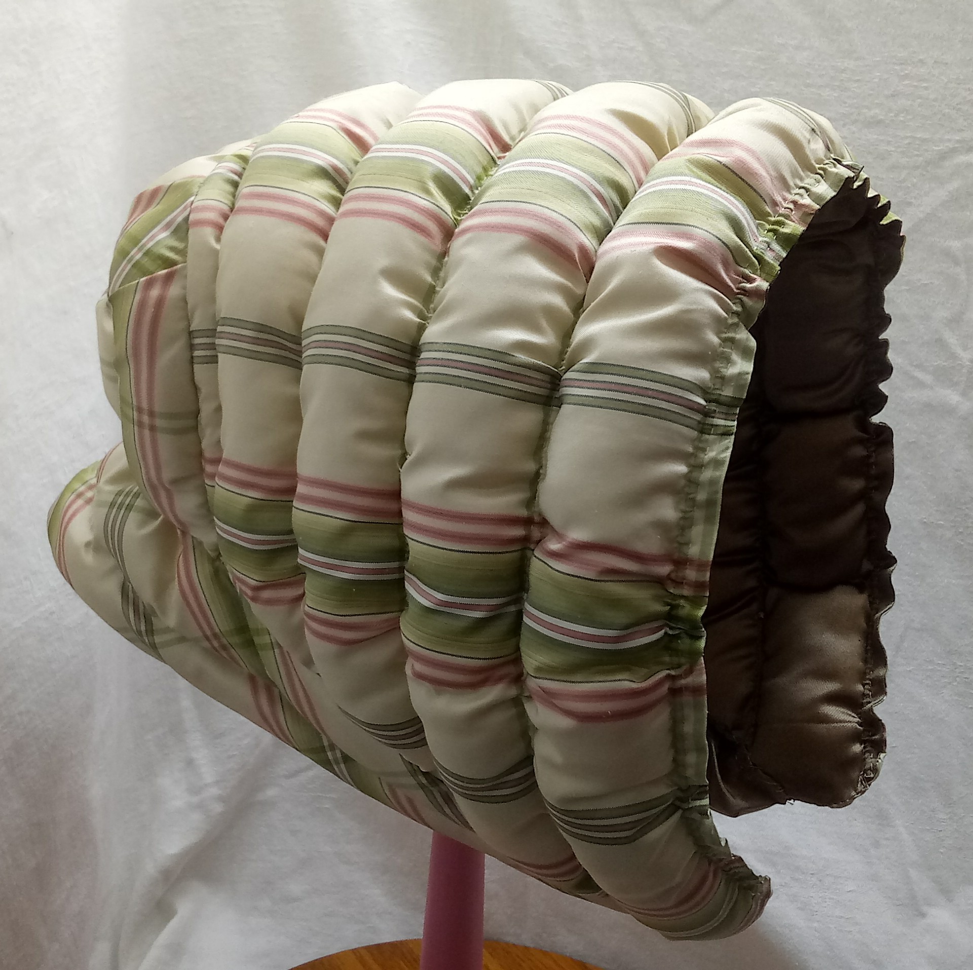 The pumpkin hood was commonly made with three pieces: the brim, crown, and bavolet. Rather than being quilted, the brim has parallel channels sewn across the head which were filled with wool wadding or down. Between these channels, narrower channels of cord help draw up the brim and give it light structure. Occasionally, some of these channels are cane or wire, though not as often as in quilted styles. The crown of this style tends to be small, with a row or two of additional wadding. The bavolet ranges from rather a rather short couple inches to as much as four inches.