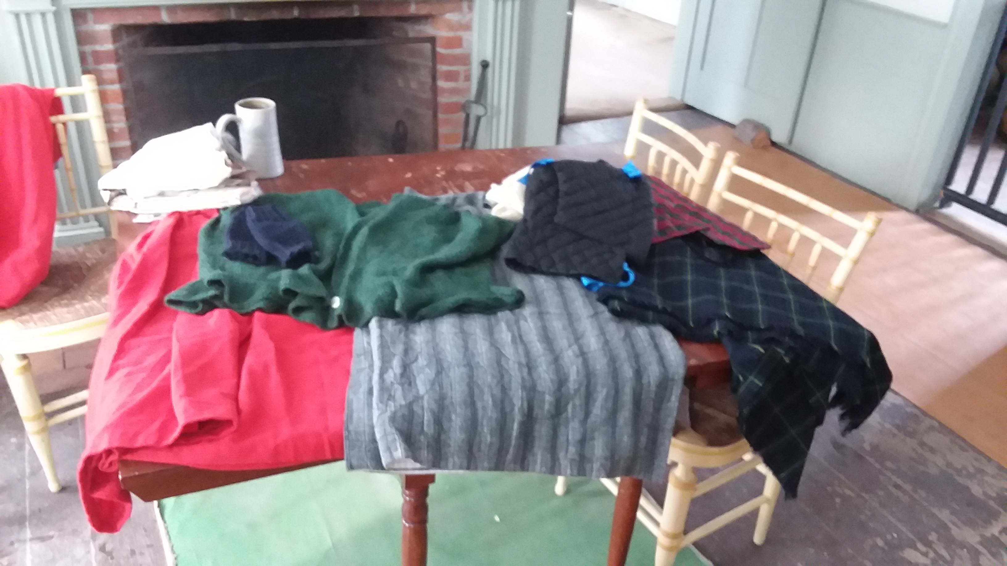 In the kitchen, I set up an assortment of handmade gifts including the dolls, winter hoods, a workpocket, and pen wiper. This seemed to get a good balance of interest. One young guestwas so caring and gentle as she held each of the dolls. Totally scared her Dad. I got most of the brim of a pumpkin hood done, but between talking and cold, cold hands, the stitching isn’t what I would like.