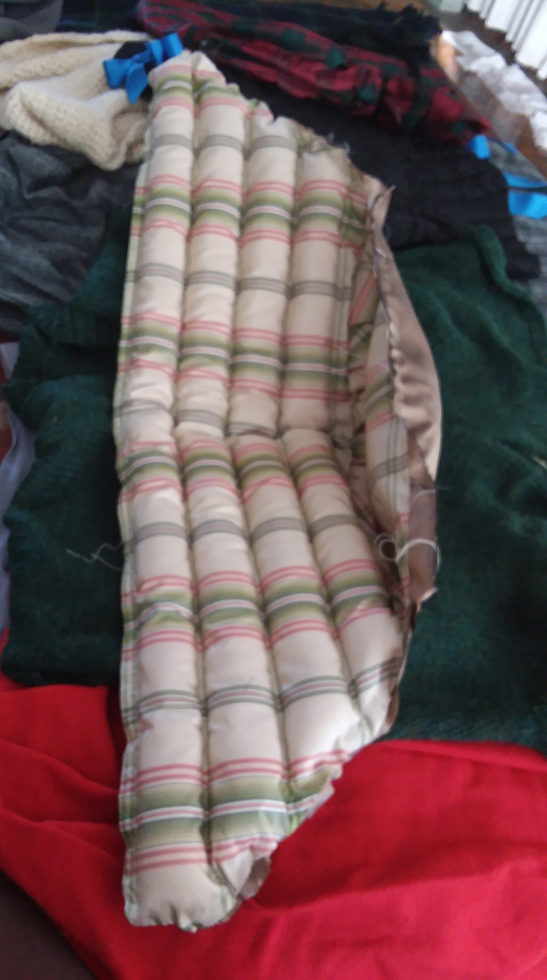 I find wool wadding to appear more frequently in originals than down. The wadding fairly evenly fills the channels, though not as firmly as some quilted hoods. These hoods are quite soft. The bavolet tends to be very lightly filled, though I suspect some loss has occurred over time for some pieces.